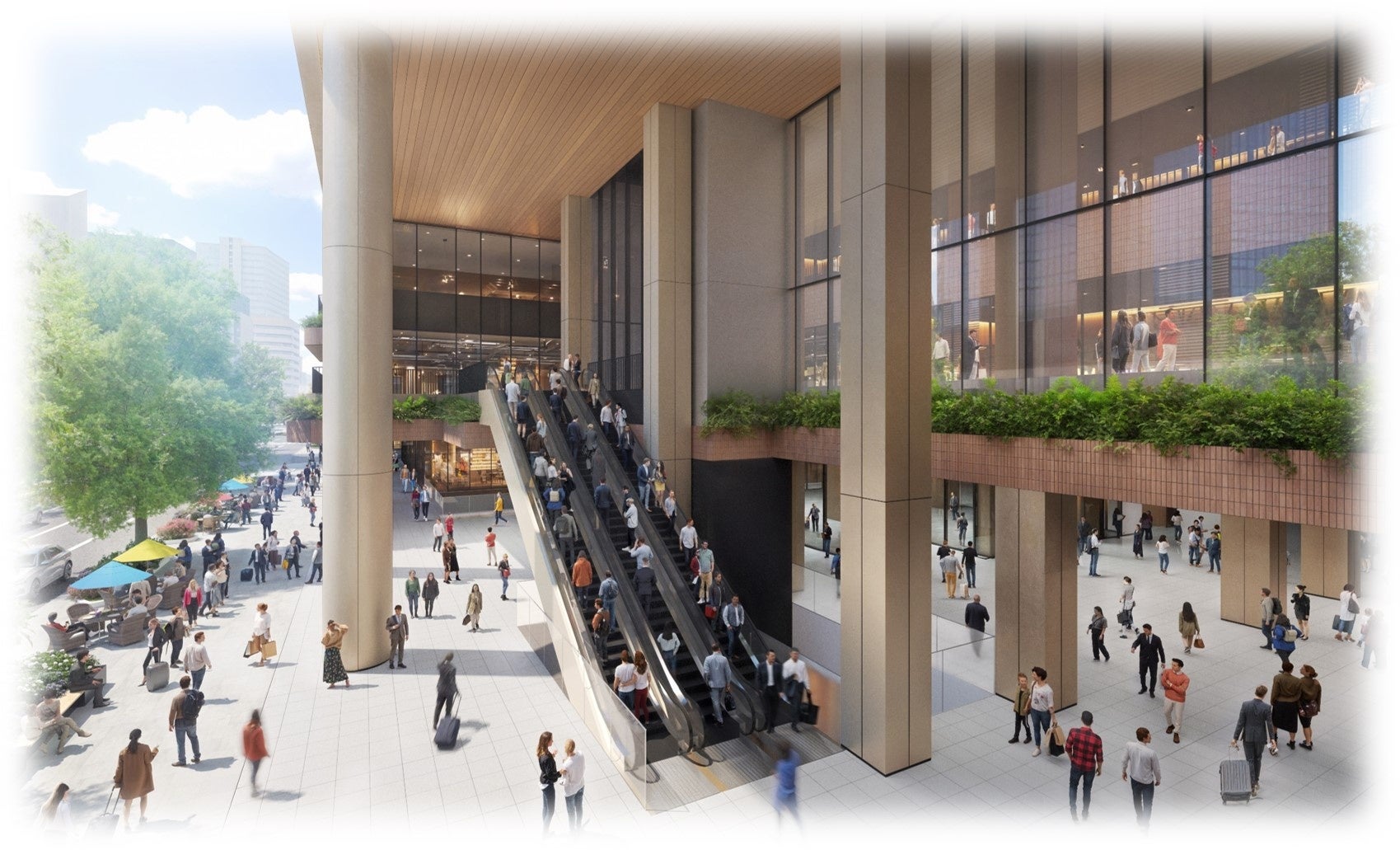 ▼名駅南方面への回遊性向上に寄与する3層の南北歩行者ネットワークと空中回廊、道路上空を生かしたゲート性のあるシンボリックなデザイン