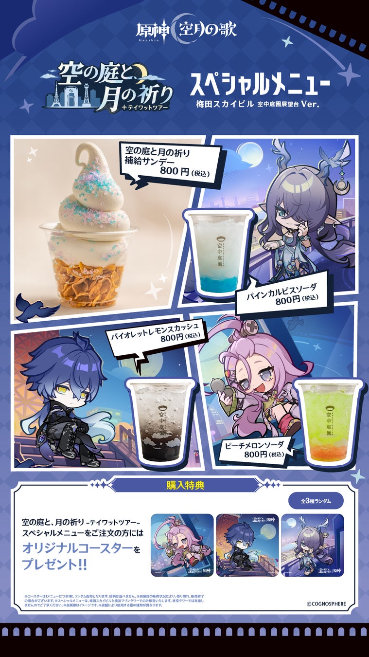 今回、イベント限定スペシャルメニューとして「パインカルピスソーダ(800円税込)」、「ピーチメロンソーダ(800円税込)」、「バイオレットレモンスカッシュ(800円税込)」、「空の庭と月の祈り補給サンデー(800円税込)」をご用意しております。