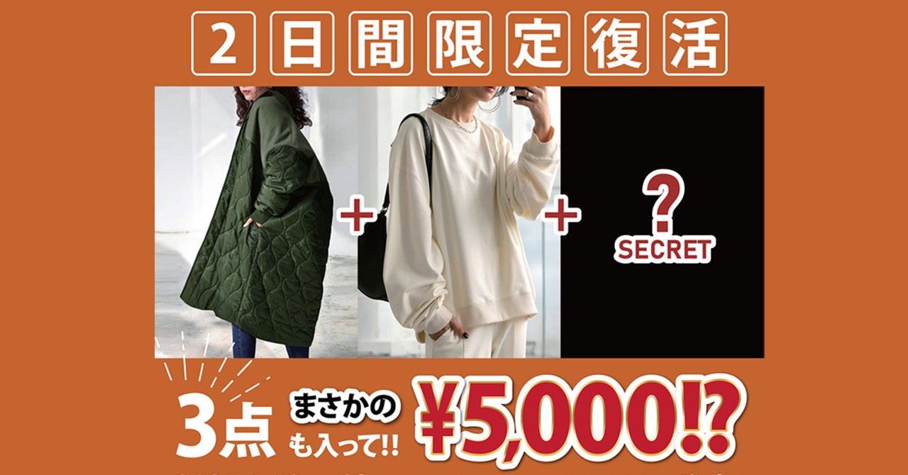 これが欲しかった!を集めました。大人気キルティングコートと大人の上質裏毛スウェット、さらにお楽しみアイテムが1点入ってお得感MAX!