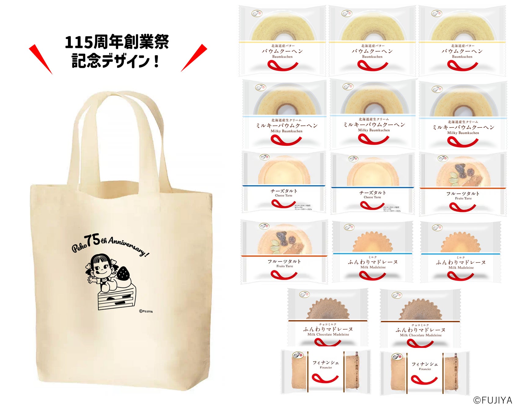2025年創業祭デザインのコットンバッグに、不二家洋菓子店の人気焼菓子を16点詰め合わせた限定詰め合わせも登場します。