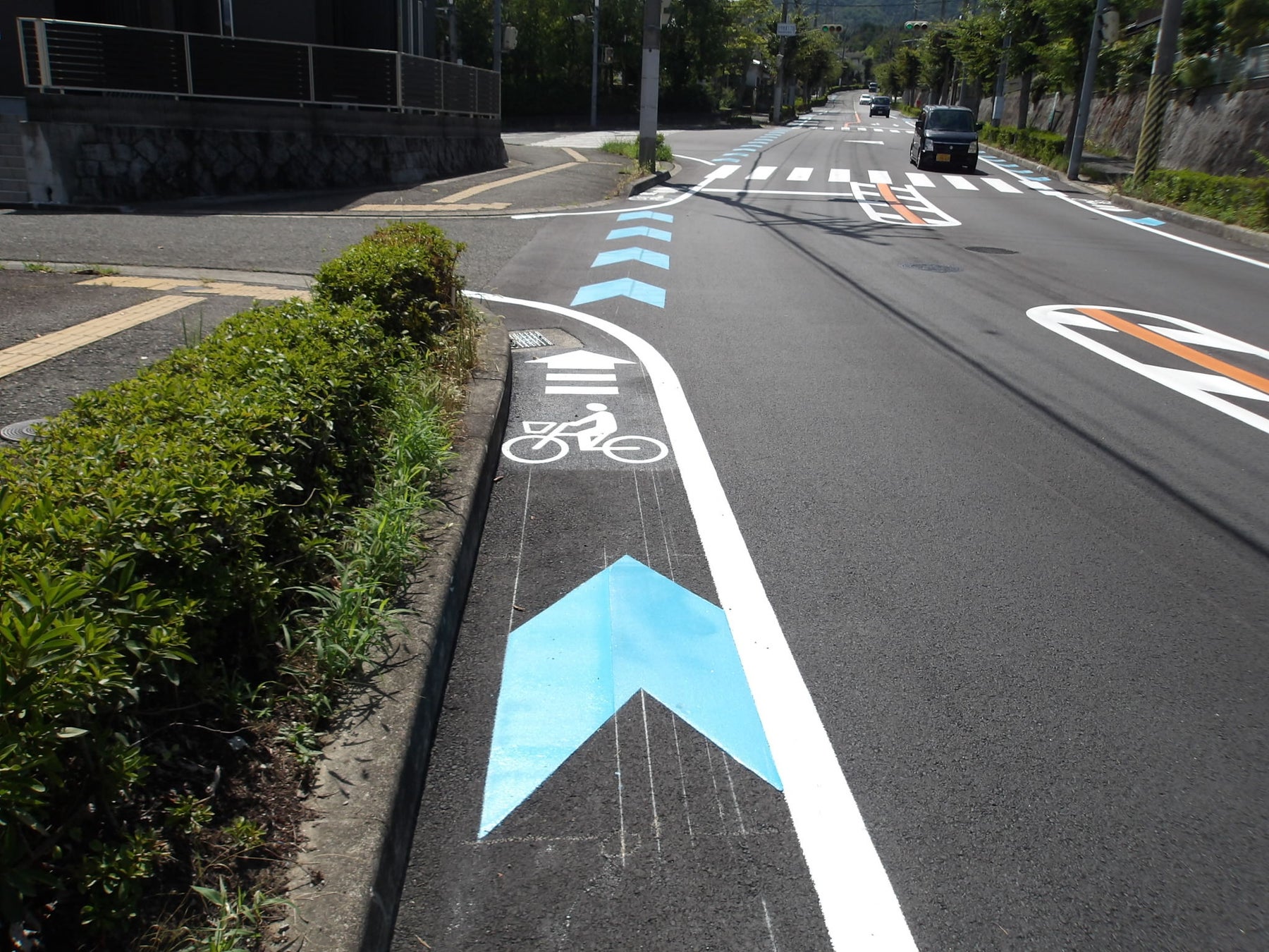 さらに、通学路にもなっている市道1314号(けやき坂1丁目)や市道1526号(丸山台1丁目)について、自転車通行空間整備工事として矢羽根型路面表示の整備や、道路の改修を行っています。