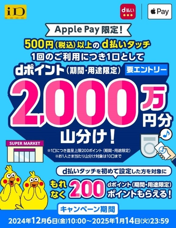株式会社NTTドコモ(以下、ドコモ)は、d払いタッチのApple Payを500円(税込)以上ご利用で2,000万円分のdポイント(期間・用途限定)を山分けして進呈する「【Apple Pay】d払いタッチ2,000万ポイント山分けキャンペーン」を、2024年12月6日(金)から2025年1月14日(火)まで開催いたします。さらに、d払いタッチをはじめてApple Payに設定したお客さまには、もれなくdポイント(期間・用途限定)を200ポイント進呈いたします。