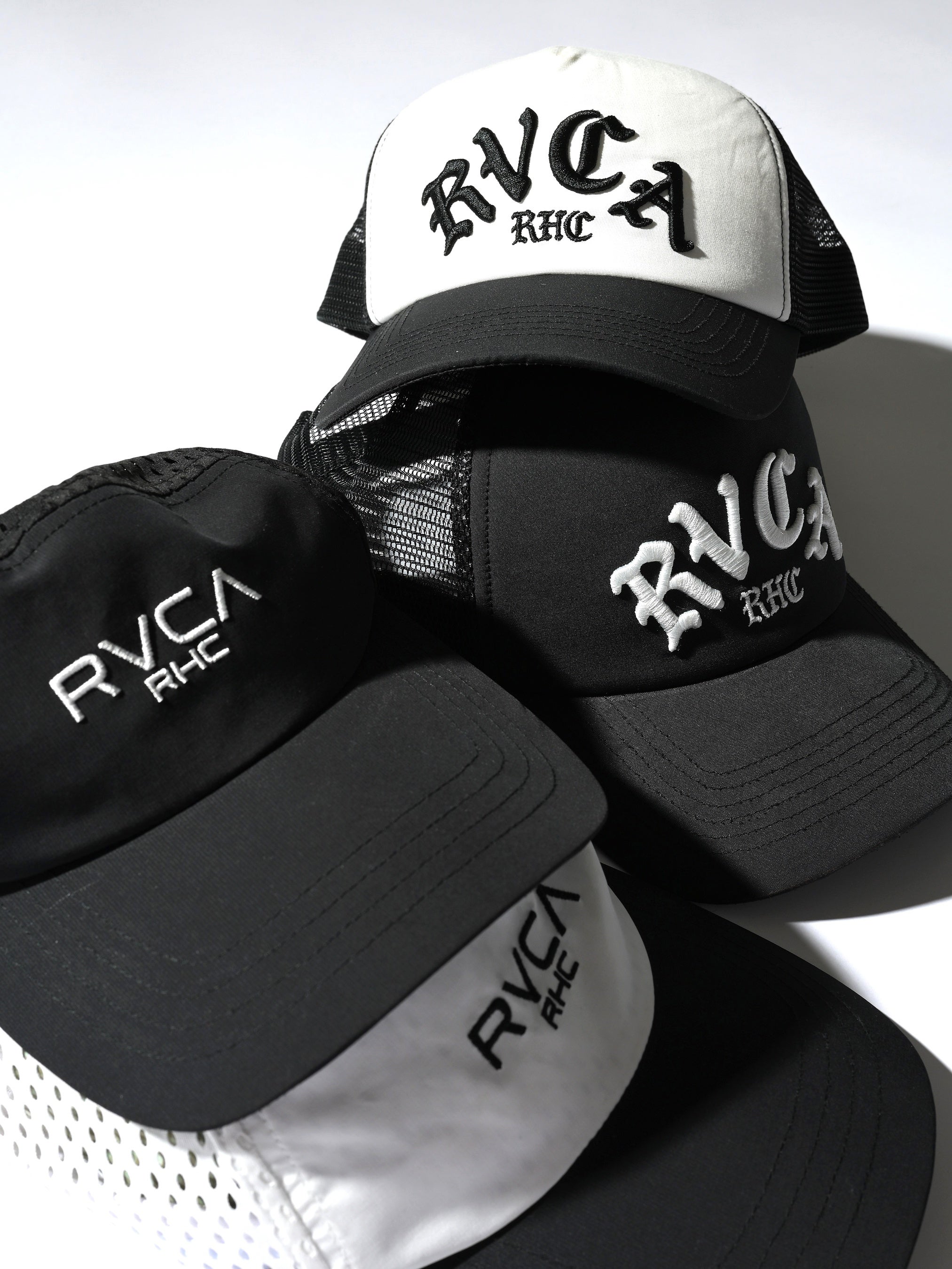 メンズ:RVCA×RHC Tee(¥9,900)、Mesh Running Cap / Mesh Cap(各¥8,800)