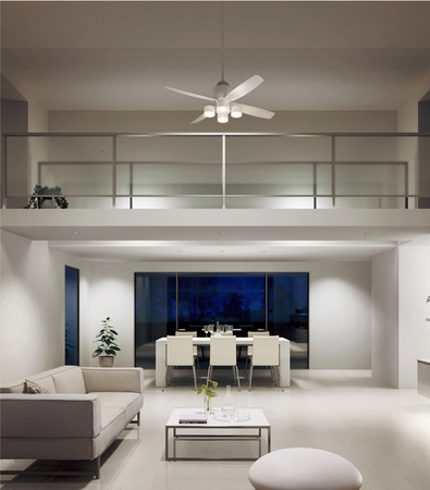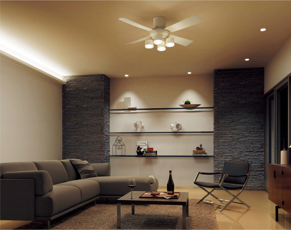 同製品はシーリングファン(単体使用可能)と、シーリングファン専用シャンデリアを組み合わせて使用するもので、専用シャンデリアにLEDタイプも新たにラインナップ。省エネのLED照明で部屋を照らし、薄型のシーリングファンで部屋の空気を循環させ、さらにエアコンと併用して冷暖房効率を上げることで、より一層の節電に貢献できます。特に冷房時には、省エネ環境温度(28℃)で快適な涼感が得られます。