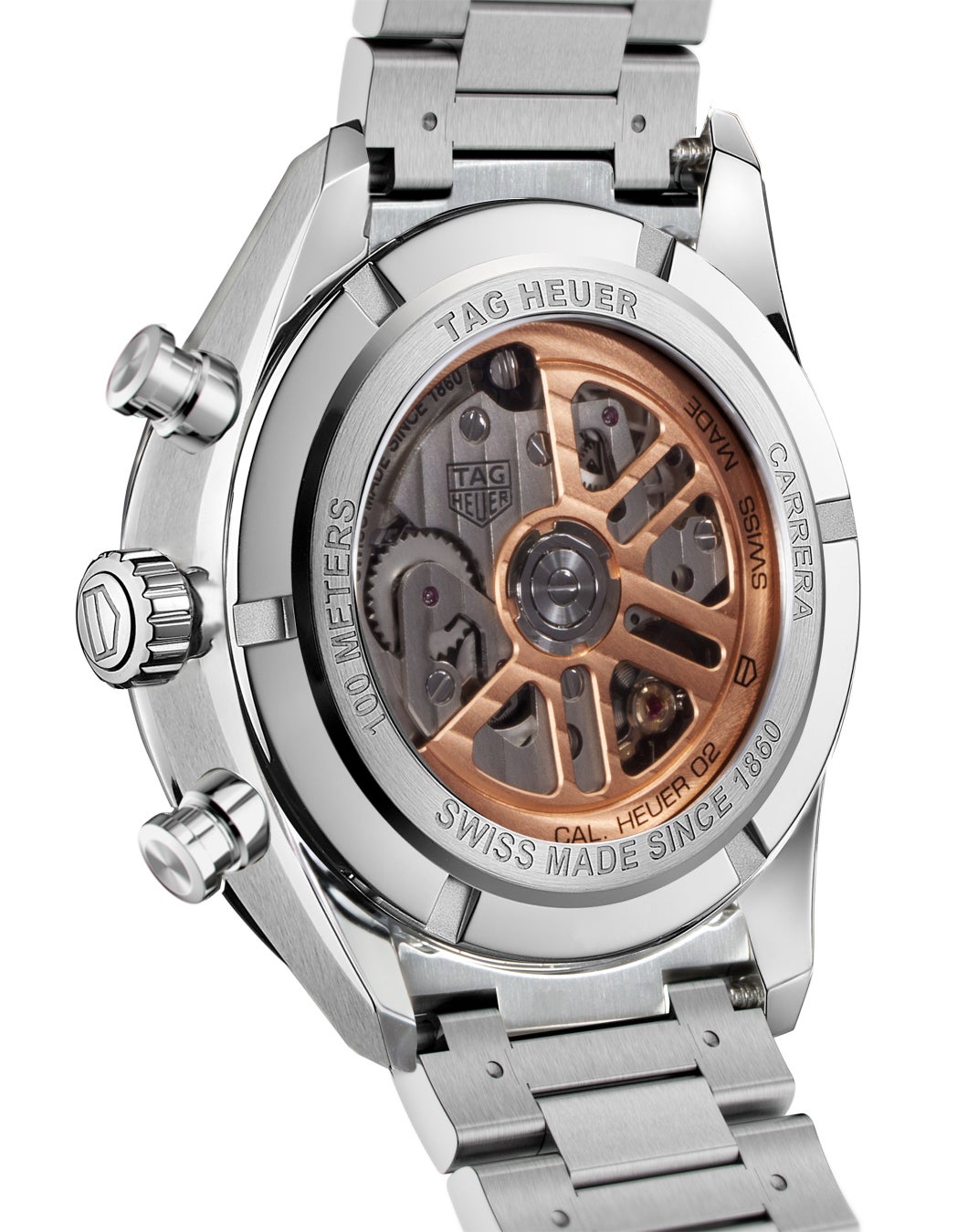 タグ・ホイヤーの自社製クロノグラフムーブメント、 「ホイヤー02」の特徴であるユニークなデザインのローター、コラムホイール、表面に施されたコート・ド・ジュネーブ装飾がサファイアケースバック越しに鑑賞できます。また、ローターには兜の験金を想起させるローズゴールドを採用し重厚感と輝きを麗しげに表現しました。また高品質なクロノグラフ計時とマニュファクチュールムーブメントを反映するコラムホイールや垂直クラッチが組み込まれており、コンポーネントの総数は168で構成され、約80時間の優れたパワーリザーブを誇ります。