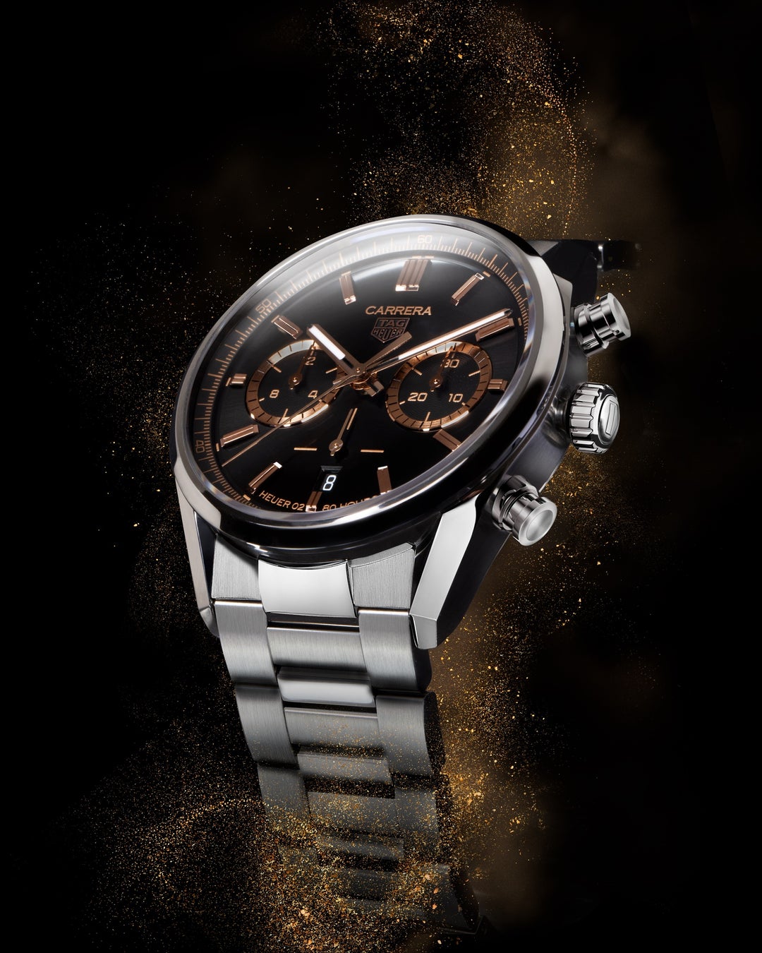 日本限定300本の「タグ・ホイヤー カレラ キャリバー ホイヤー02 クロノグラフ ジャパンリミテッドエディション」は、42mmのダイヤルにブラックサンレイ加工が施され、3時位置と9時位置のクロノグラフ時分カウンター、6時位置のスモールセコンドにローズゴールドカラーのラッカーを、時分針、クロノグラフ針、アプライドのアワーインデックスとタグ・ホイヤーのロゴにはローズゴールドプレートを施し、アイコニックな“Carrera Heuer 02 80 Hours”の文字はローズゴールドカラーでプリントしました。ブラックのダイヤルの上で一際力強く美しい光沢を放つローズゴールドのラインは、抜刀のシルエットを彷彿とさせ、3時位置と9時位置に配されたアズラ―ジュ仕上げのインダイヤルがさらに奥行きを作り腕元を華やかに演出します。