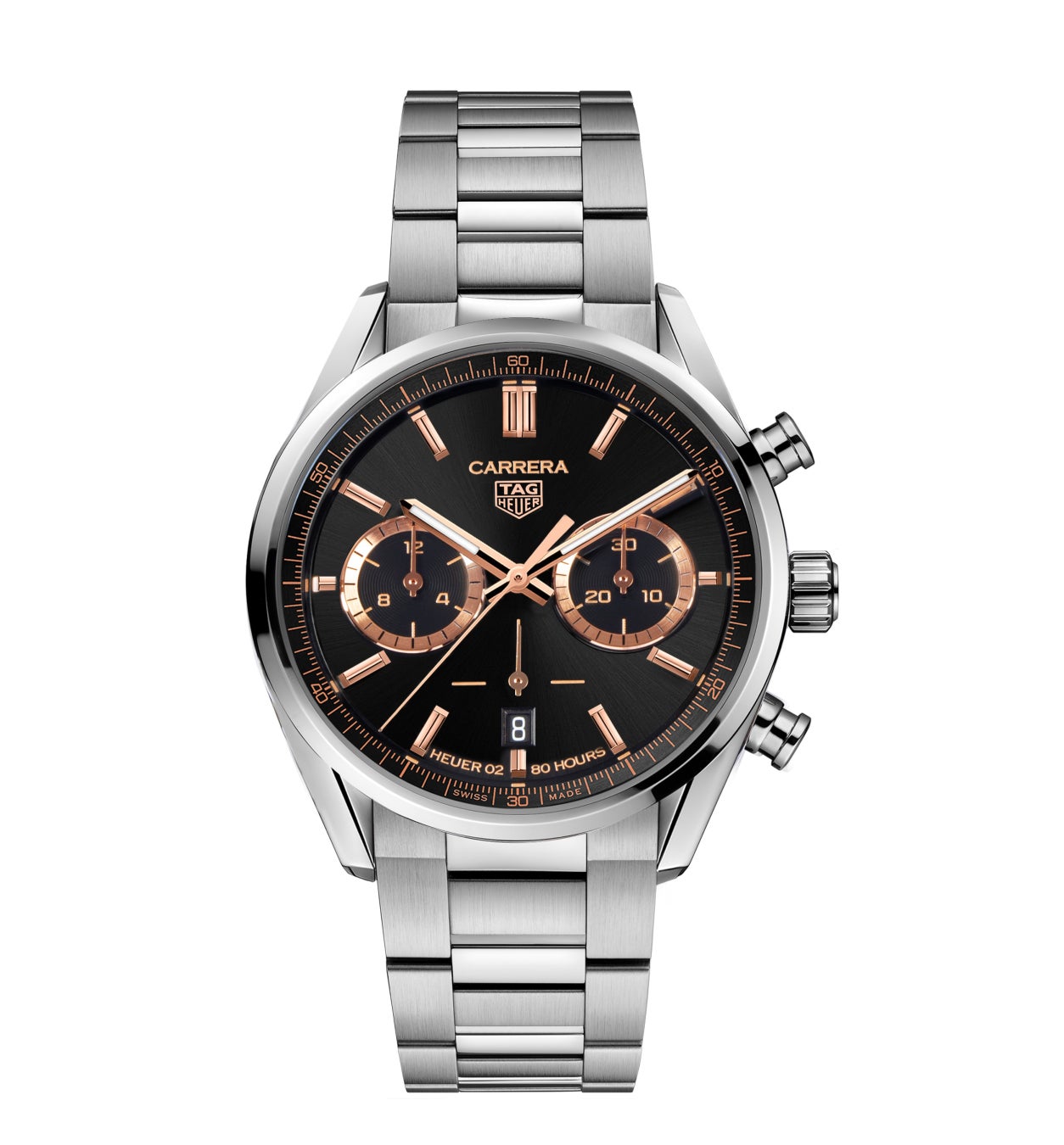 「タグ・ホイヤー カレラ キャリバー ホイヤー02 クロノグラフ ジャパンリミテッドエディション」は、フォールディングクラスプを備えたステンレススティール製ブレスレットを採用しました。それぞれの時計のケースバックには300本の限定モデルの1本であることを示す「001-300/300」のシリアルナンバーが刻印されています。エクスクルーシブなこの時計には、ローズゴールドのデザインとコーディネートされたボックスにトラベルケースが付属します。
