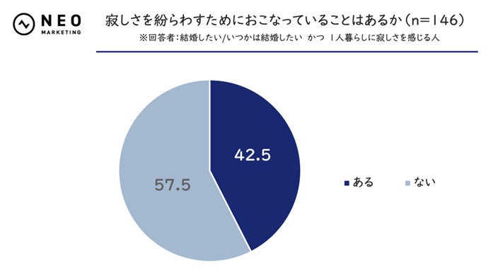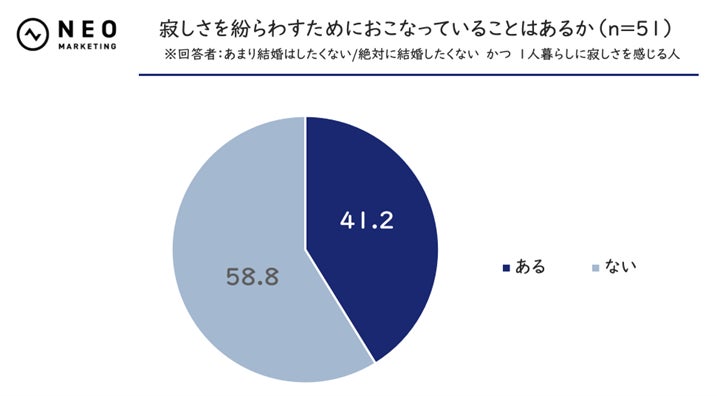 「ある」と回答した人の割合は①で42.5%、②で41.2%と、両者に大きな違いはみられませんでした。結婚願望の有無にかかわらず、一人暮らしをしていて寂しさを感じる人は、回避する何かしらの行動をとっている人が多いようです。趣味に没頭する、インターネット上のコミュニティに参加するなど、さまざまな回避行動が考えられそうです。
