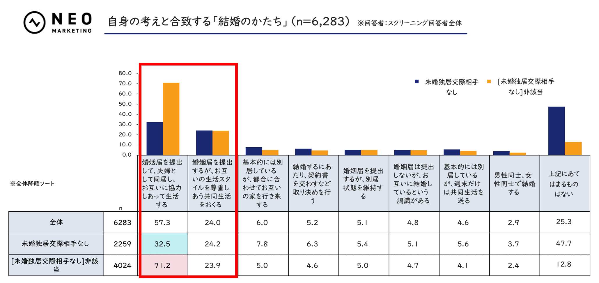 この結婚のかたちについて、自身の考え方・スタイルと合致していると回答した割合が「未婚独居交際相手なし」の人で32.5%であったのに対し、「未婚独居交際相手なし」非該当者は71.2%もの票を集めています。いずれにしても回答者の割合はトップではあるものの、両者には38.7ポイントもの差が生じていました。