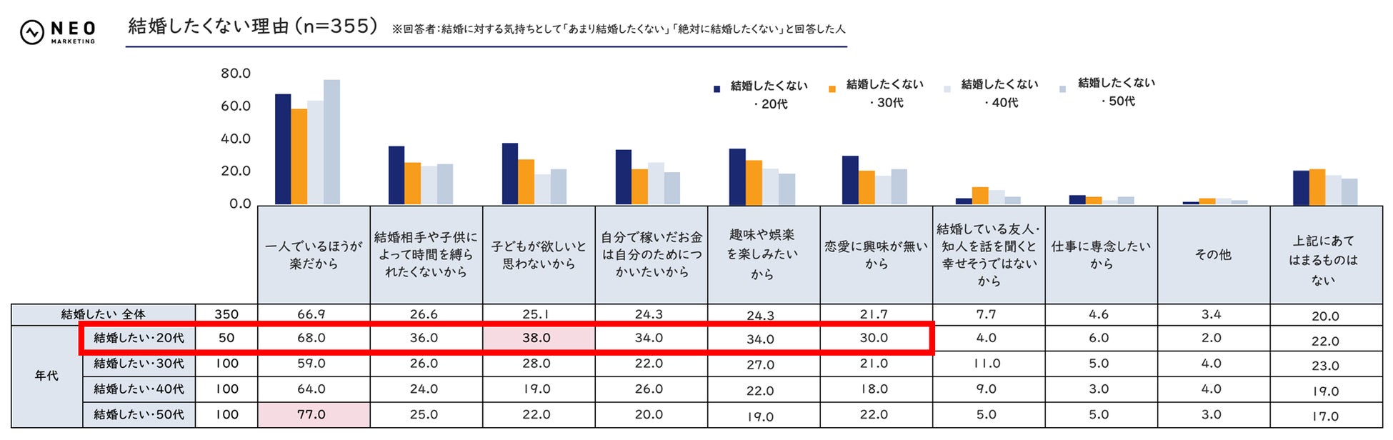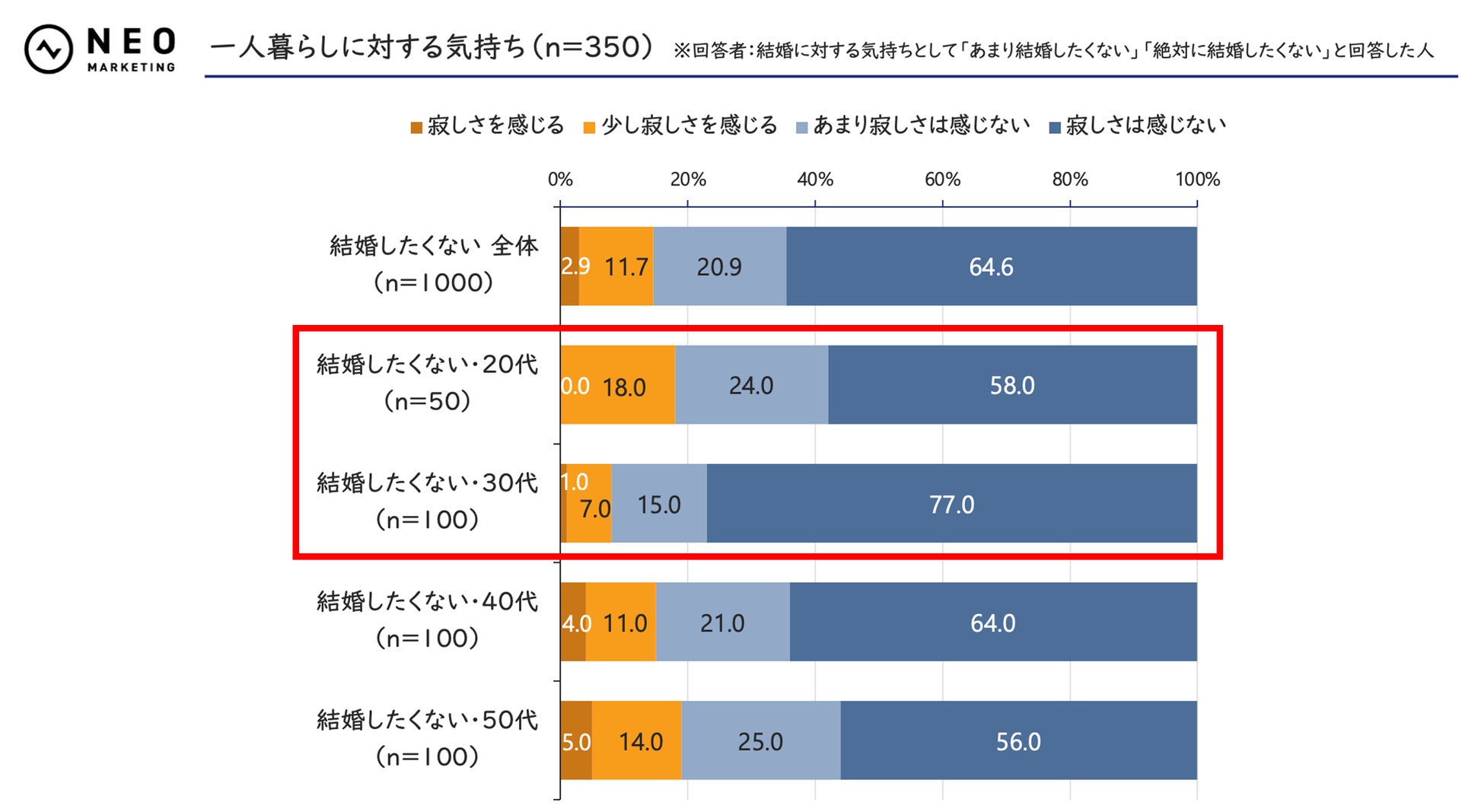20代は他の世代よりも「結婚したくない」ことに明確な理由を持っている人の割合が多い。「結婚願望無し30代」の77%は、一人暮らしに寂しさを感じない。