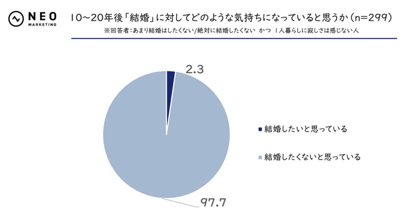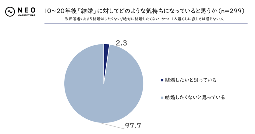 前掲した設問【一人暮らしに対する気持ち】(回答者は結婚願望なし)にて「あまり寂しさは感じない」「寂しさは感じない」と回答した人に対し、「10年後~20年後のあなたは、『結婚』に対してどのような気持ちになっていると思うか」お聞きしました。