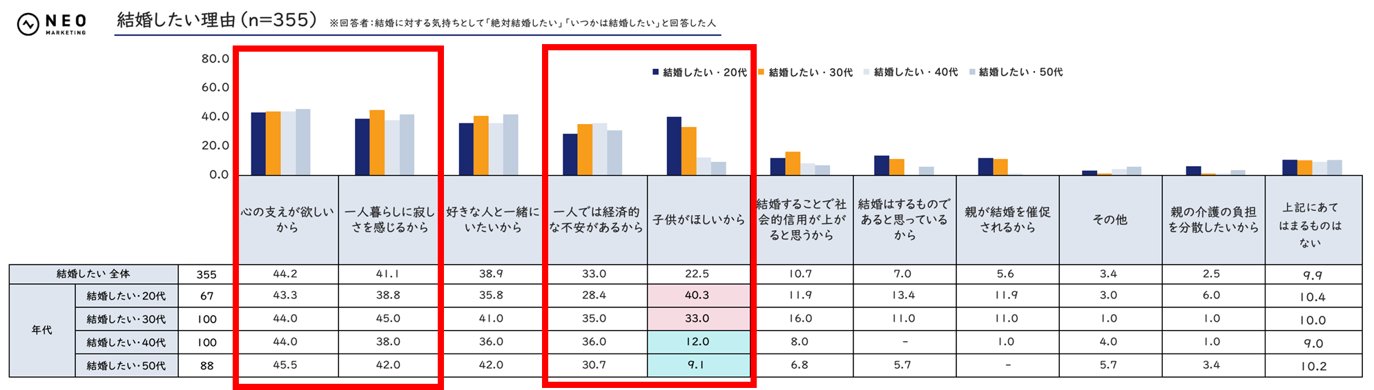 「子供がほしいから」結婚したいと考える割合は、20代で40.3%となっており、43.3%の「心の支えが欲しいから」という理由と同程度の位置付けであることがわかります。30代から40代にかけては「子供がほしいから」という理由よりも、「一人では経済的な不安があるから」という理由に徐々に意識が向けられていく様子もみられました。