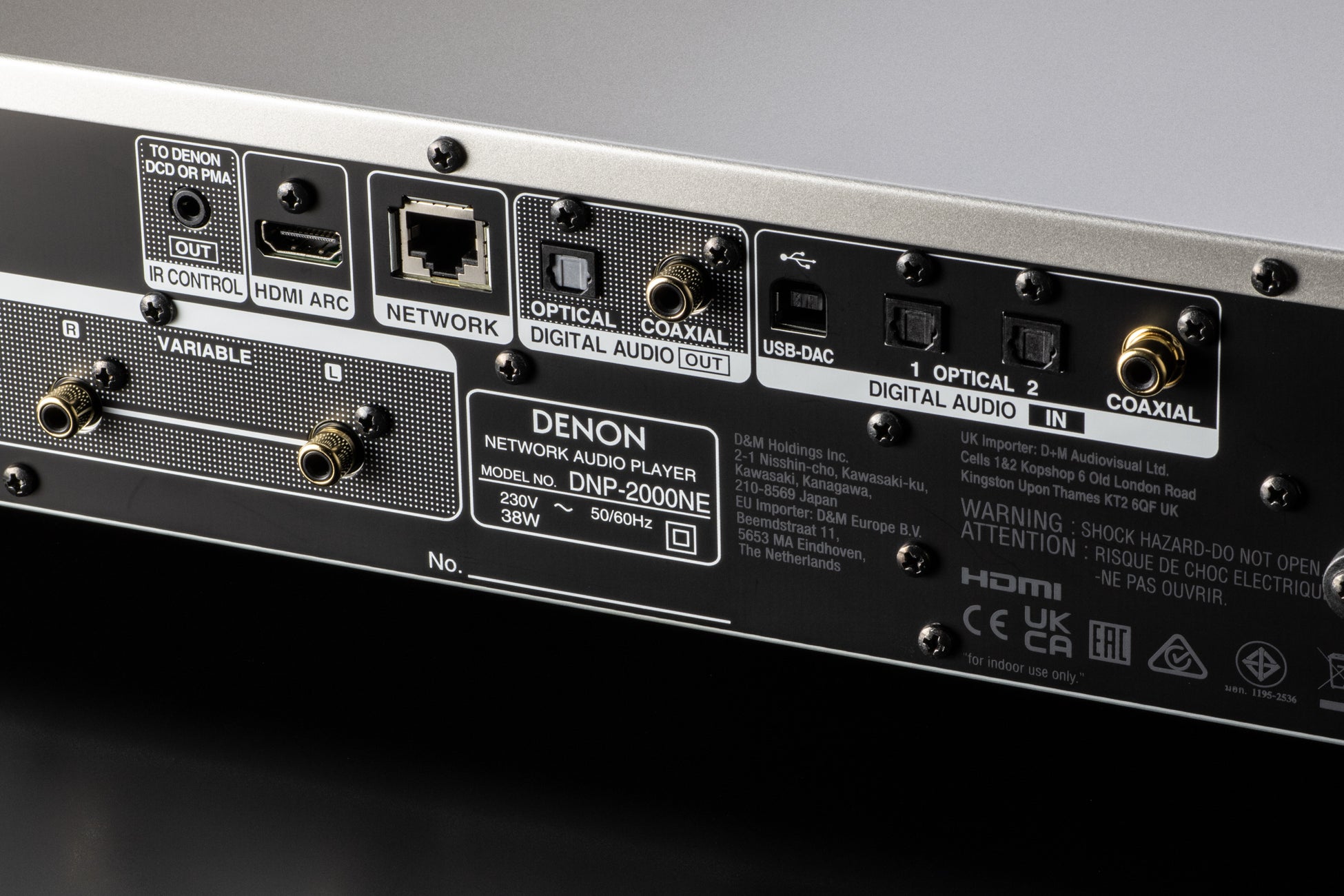 さらにDNP-2000NEは、デノンのHi-Fiオーディオコンポーネント製品としては初めてHDMI端子を装備しました。HDMI ARC(Audio Return Channel)に対応しており、ARC対応テレビと接続してテレビ放送やテレビに搭載されているアプリの音声、テレビに接続されたその他のプレーヤーやゲーム機の音声をDNP-2000NEを介してHi-Fiシステムで高音質再生することができます。DNP-2000NEでは、最大192 kHz / 24 bitまでのリニアPCM(2ch)信号を再生することができます。DNP-2000NEは、HDMI CECに対応しているため、CEC対応テレビとHDMIケーブルで接続すると、電源の連動や入力ソースの自動切り替え、テレビのリモコンでの可変出力の音量操作などが行えます。また、IRコントロール端子を備えるデノンのプリメインアンプと組み合わせた場合には、アンプの電源や入力ソース、音量も同様に連携させることができます。
