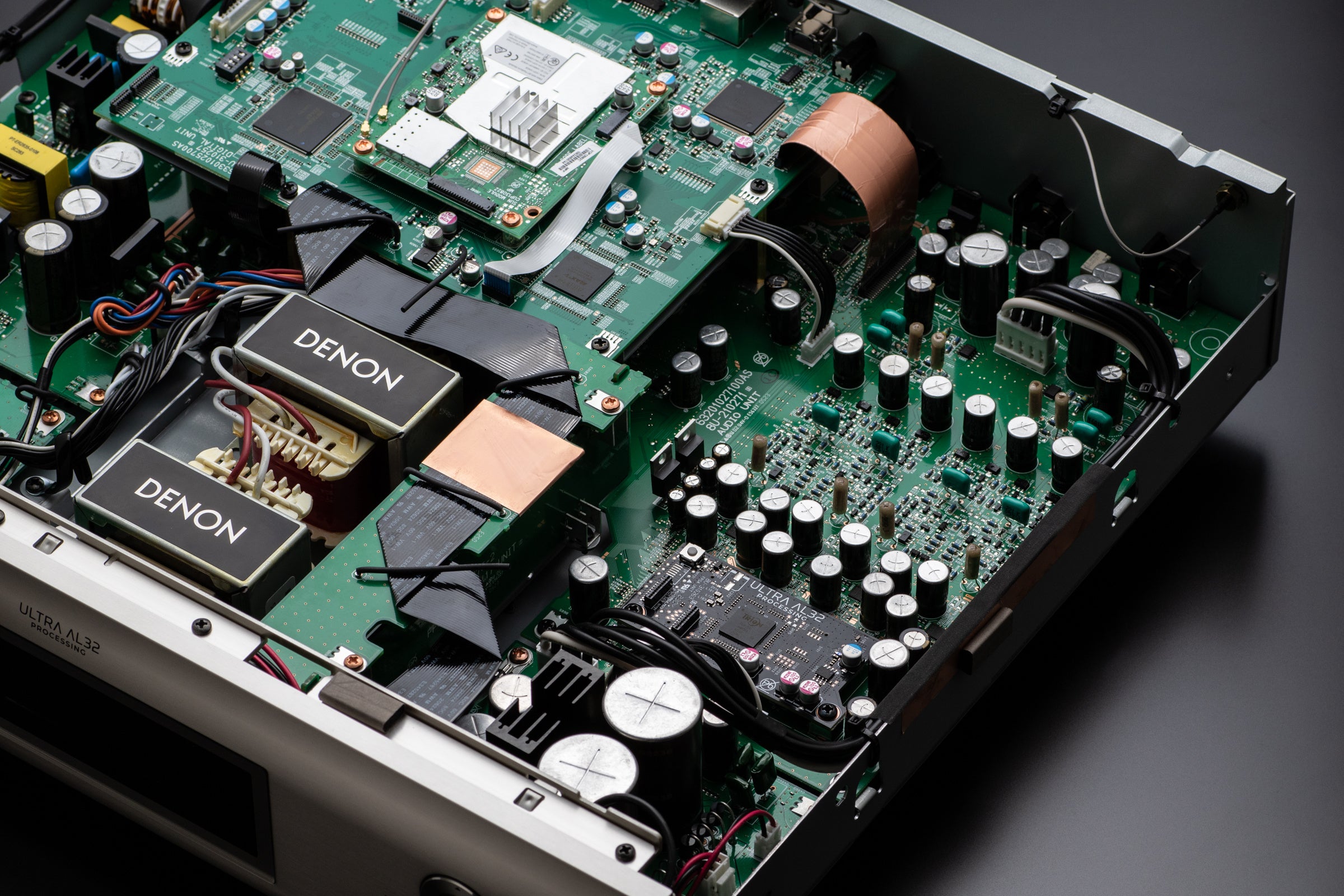 デジタルオーディオプレーヤーの音質の要であるD/A変換回路は110周年記念モデルのSACDプレーヤー「DCD-A110」と同等の回路構成を採用しています。デノンが誇るアナログ波形再現技術の最新かつ最上位バージョンである「Ultra AL32 Processing」および4基の差動出力型DACを使用したQuad-DAC構成はDCD-A110からそのまま継承しています。D/Aコンバーターの出力を受けるI/V変換回路もDCD-A110と同様のフルディスクリート構成とし、サウンドマスターによる徹底的なサウンドチューニングを実施しています。その結果、アナログオーディオ回路内のコンデンサーや抵抗、トランジスターなどのパーツは、ハイエンドモデルである「DCD-SX1 LIMITED EDITION」に迫るほどの高音質パーツへと変更され、圧倒的な高解像度とどこまでも広がるサウンドステージを両立する「Vivid & Spacious」なデノンサウンドを実現しました。