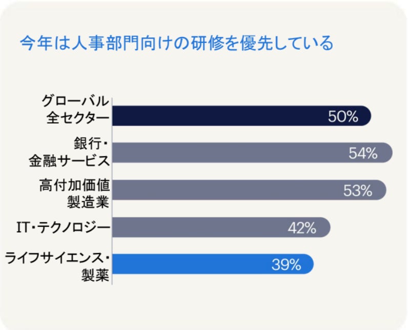 ランスタッドが世界21か国の経営層に実施した人材動向調査「タレントトレンドレポート2025*²*³」によると、90%が「人事部門の役割がより重要に、戦略的に変化してきている」と回答している一方で、69%は、依然として人事が戦略の話し合いの場に呼ばれるのが遅すぎると感じていると回答しています。また今年は人事部門の向けの研修を優先しているという回答も、業種によりばらつきはあるものの、一定数を超えています。