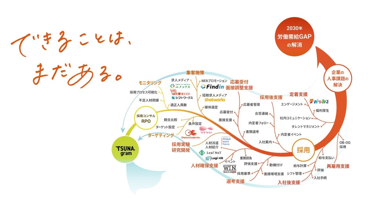 日本の社会課題である「2030年労働需給GAP解消」を目指す、ソリューションカンパニーであるツナググループは、コンサルティング×RPO(採用代行)×データベースを基軸事業として、従業員1,000名を超える大手企業を中心にあらゆるソリューションを提供しております。