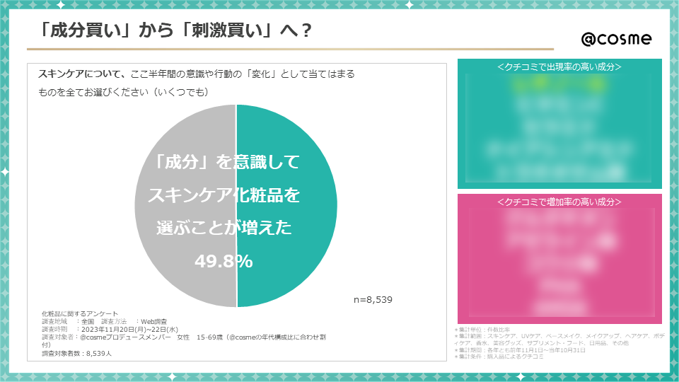 アイスタイルが昨年実施した化粧品に関するアンケートでも、ここ半年間の意識や行動の変化として、“成分を意識してスキンケア化粧品を選ぶことが増えた”という方が約半数にのぼり、「成分買い」をしている方の割合も過去と比較して増えていると考えられます。