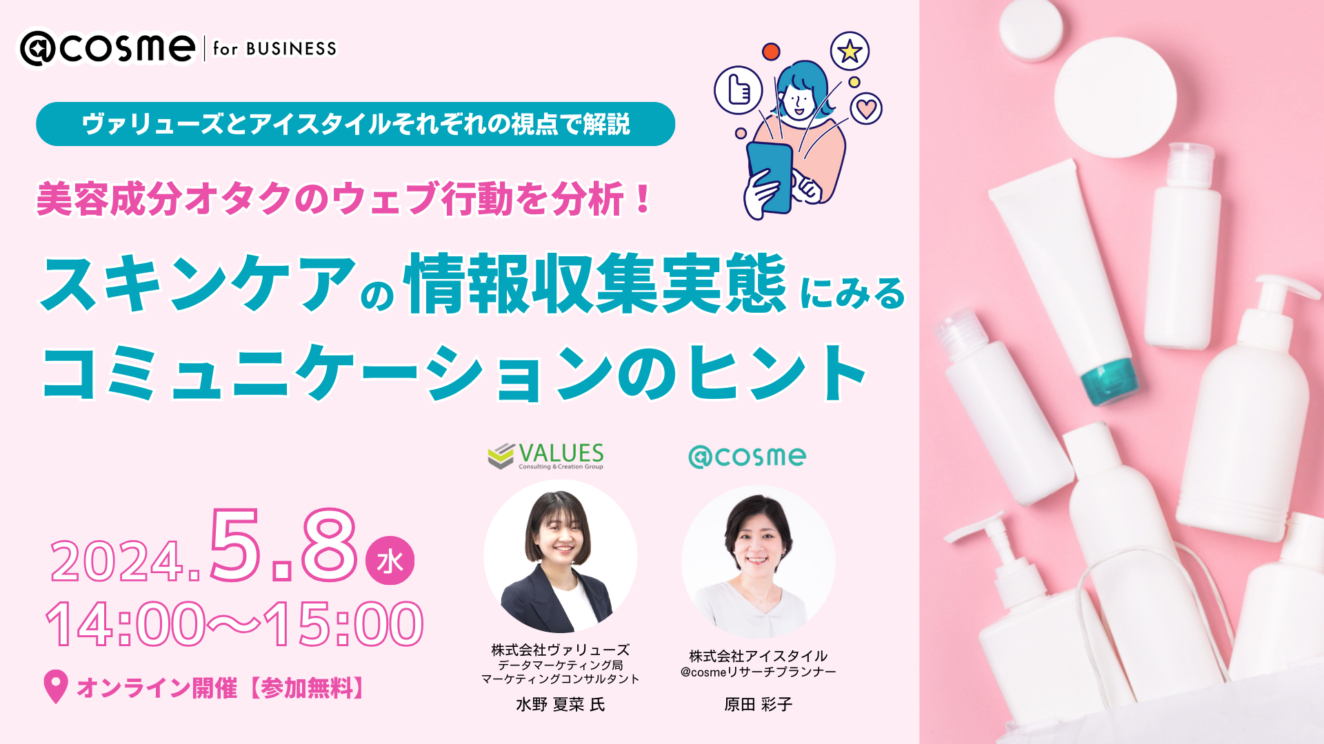 株式会社アイスタイル(代表取締役社長 :遠藤 宗)は、2024年5月8日(水)に、ウェビナーイベント『美容成分オタクのウェブ行動を分析!スキンケアの情報収集実態にみるコミュニケーションのヒント』を開催することをお知らせいたします。