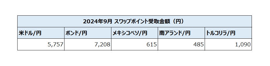SBI FXトレード株式会社(本社:東京都港区、代表取締役社長:藤田 行生)は、2024年9月のスワップポイントの実績を公表しましたことをお知らせいたします。