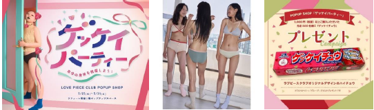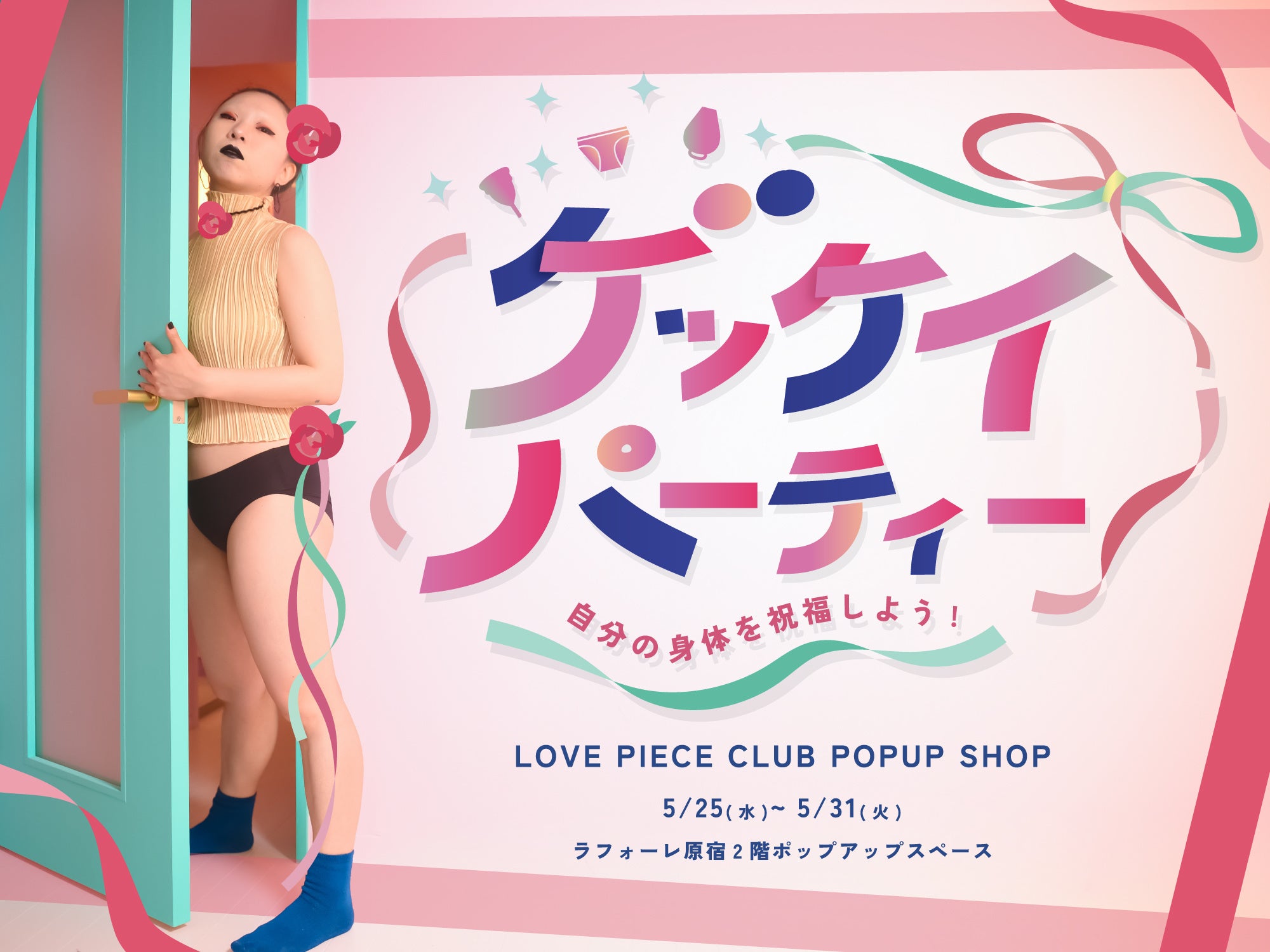 「GEKKEI PARTY LOVE PIECE CLUB」は、自分の身体を明るくポジティブに考えるラブピースクラブ(LOVE PIECE CLUB/ラフォーレ原宿B0.5F)によるPOP UP SHOPです。ラブピースクラブは、1996年に「わたしのからだはわたしのもの」という思いで、北原みのり創業者が設立したフェムテックストアで、最先端の生理用品やフェムテック、ジェンダーやセクシュアリティーを扱うフェミニズムの書籍、安全に楽しめるプレジャートイなど、女性による女性のための商品を幅広く扱っています。今回のイベントでは、100人いれば100通りの生理、腹痛がひどいひともいれば、全身がだるい人、眠くて仕方がない人などさまざまいる中で、自分の身体に明るく向き合うための企画となります。
