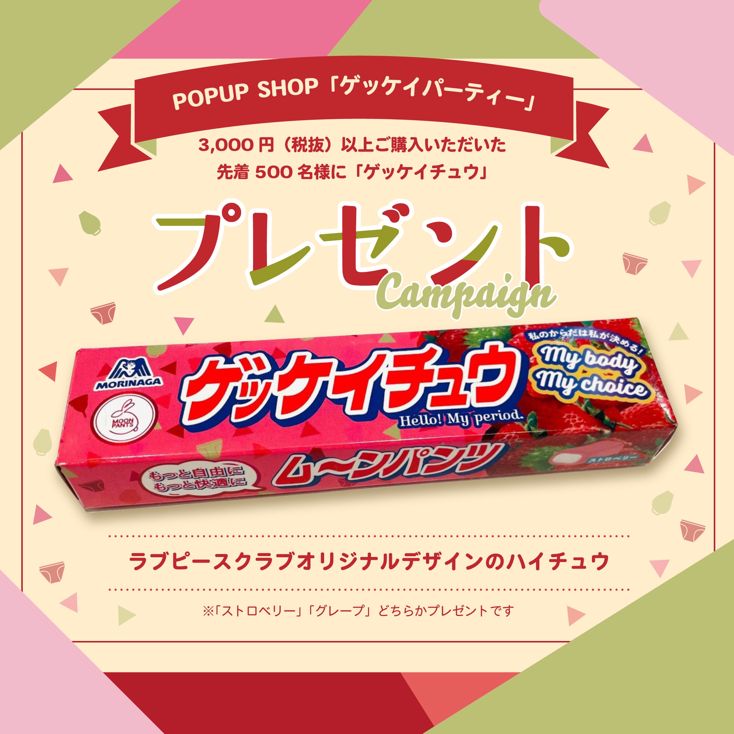 ショップでは、5月28日の世界月経衛生デーに合わせ、生理中の身体が今よりも楽に、自由になるアイテムを世界中からセレクトして販売。ボディからデリケートゾーンまで、自分の身体が楽になるケアアイテムや、月経を気持ちよく過ごせる商品を取り揃えます。また、あずみ虫や竹井千佳などの女性アーティスト20名による子宮モチーフ作品を展示・販売いたします。さらに、会期中は、対象商品を3,000円以上お買い上げのお客様にオリジナルハイチュウ「ゲッケイチュウ」や「BODY FANTASIESボディスプレー 50ml」を数量限定でプレゼントいたします。※なくなり次第終了となります
