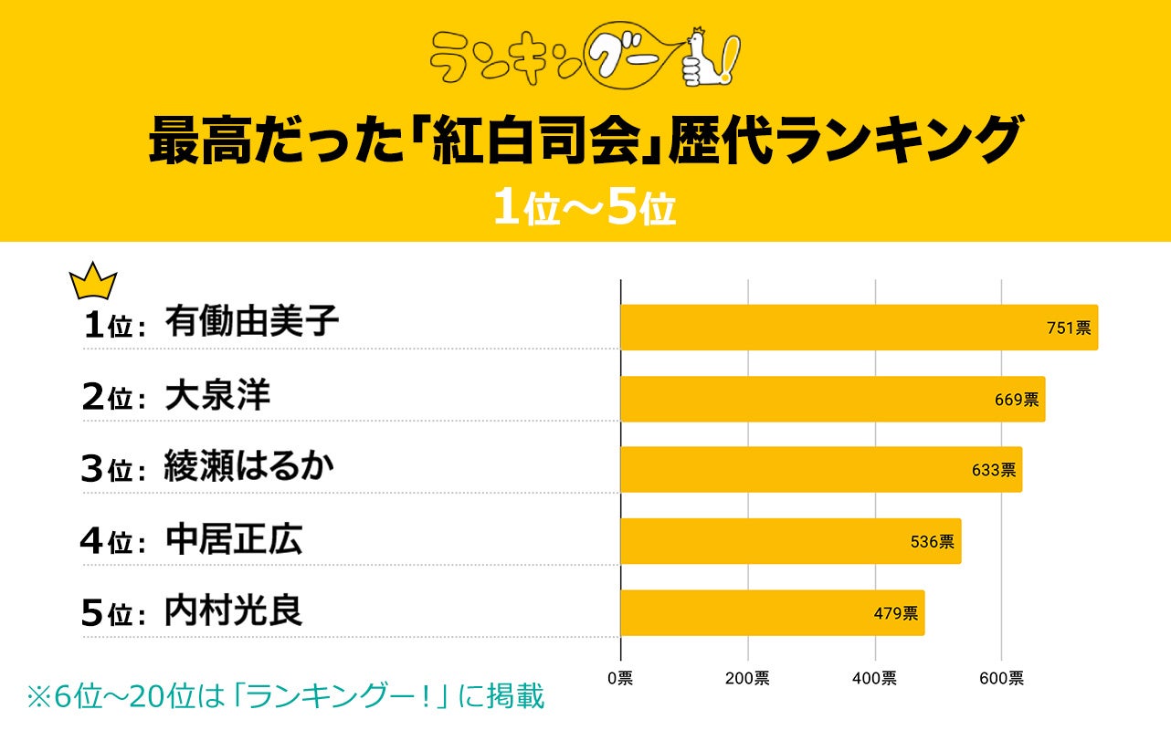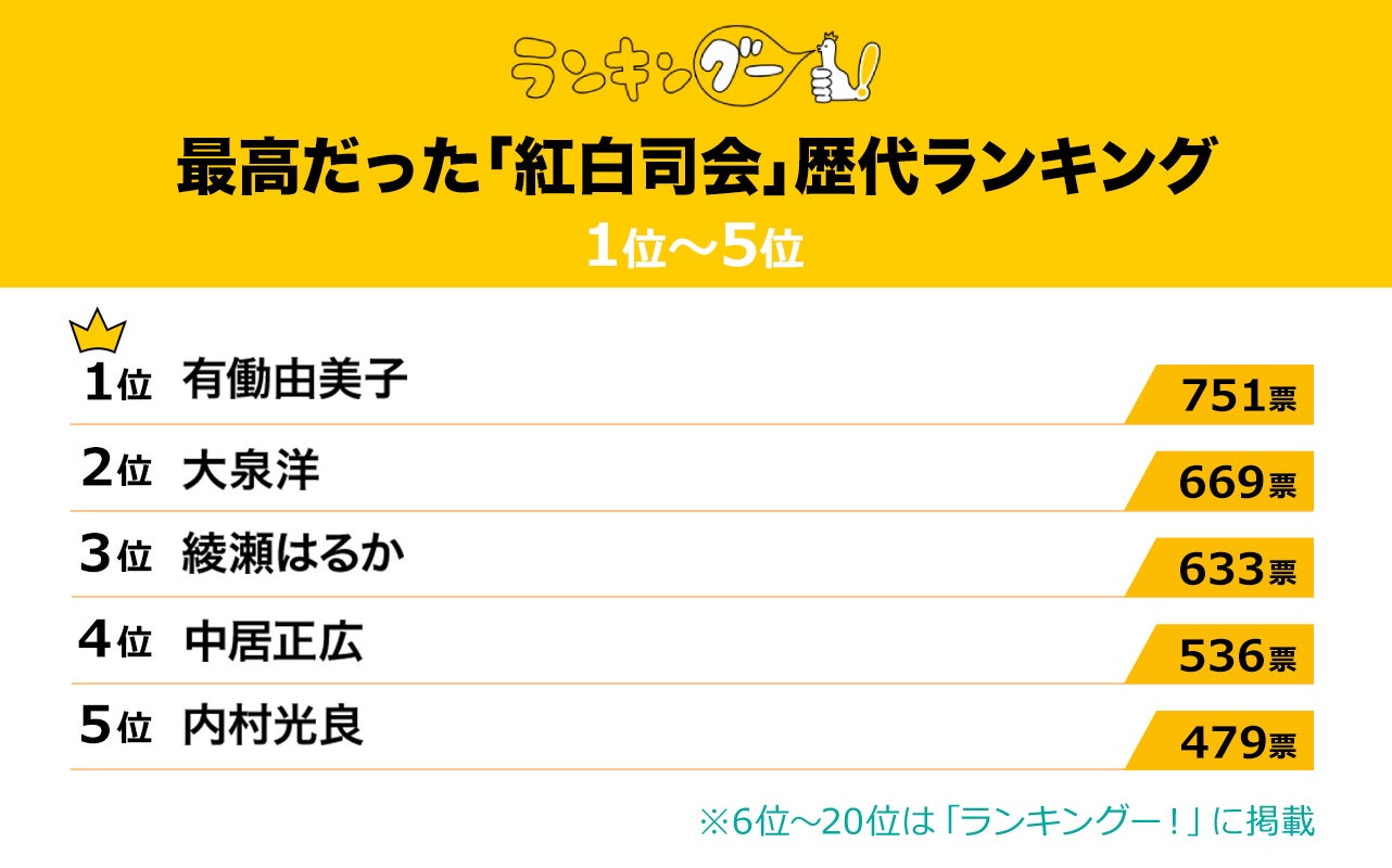 ランキングー!では歴代の「紅白司会」をピックアップし、ランキングを調査。全年代の男女(性別回答しないを含む)8,458名にアンケートを行い、TOP20を決定しました。ここではTOP5をご紹介します。