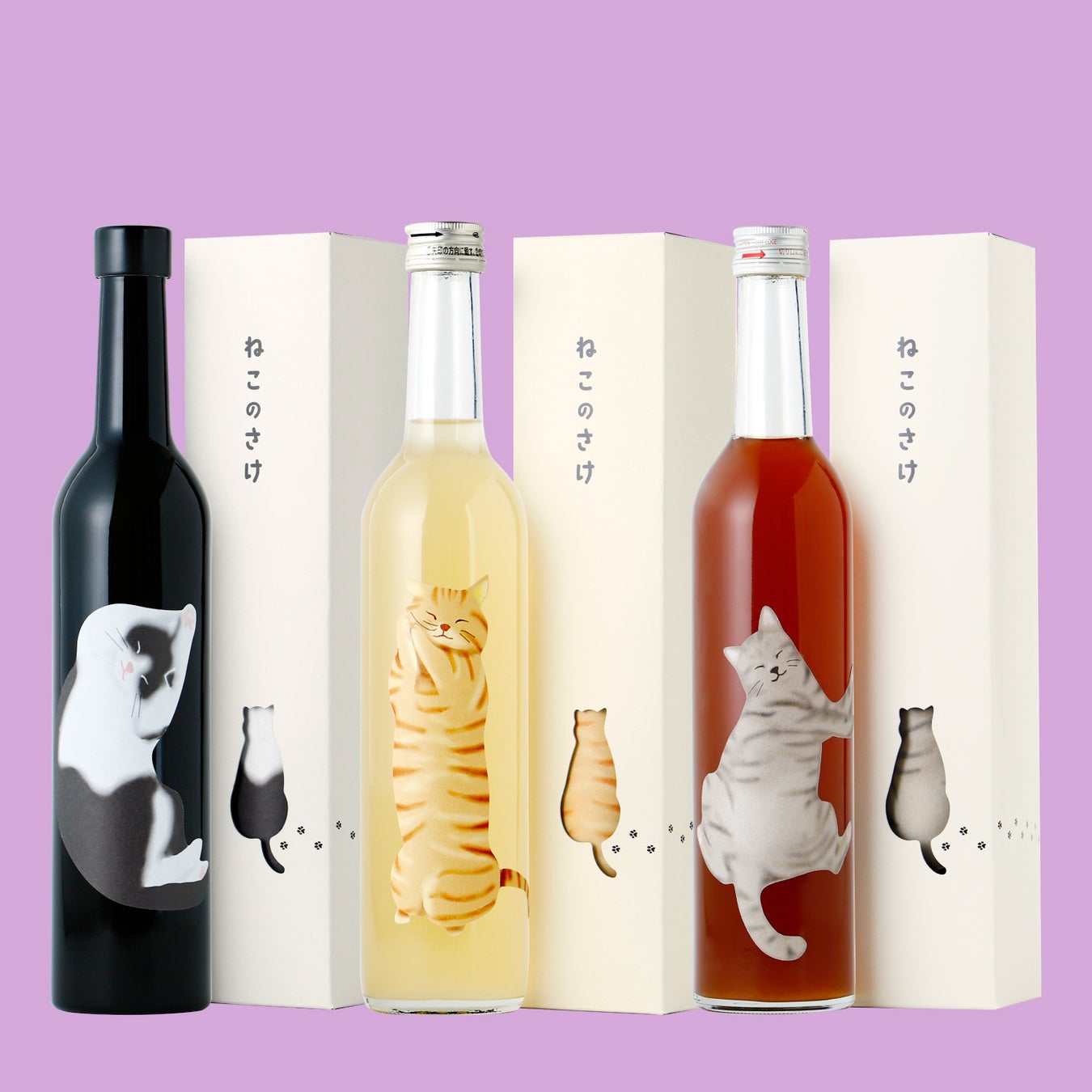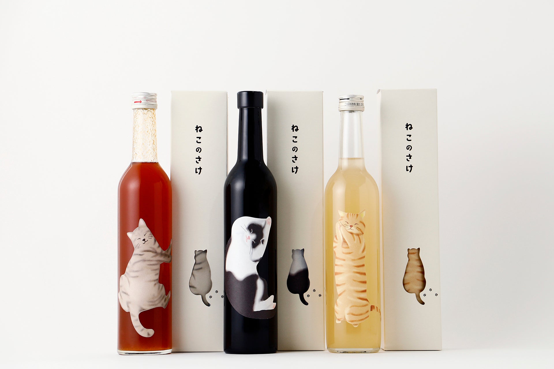 「ねこ好き」の方々のために生まれた「ねこのさけ」が登場しました。気持ちよさそうに伸びをするハチワレ柄のねこの姿が描かれた「ねこのさけ -日本酒-」と、ごろりと寝転ぶキジトラ柄のねこの姿が描かれた「ねこのさけ -梅酒-」、可愛らしくおねだりポーズをしながら熟睡する茶トラ柄のねこの姿が描かれた「ねこのさけ -果実酒-」の、全3種類です。