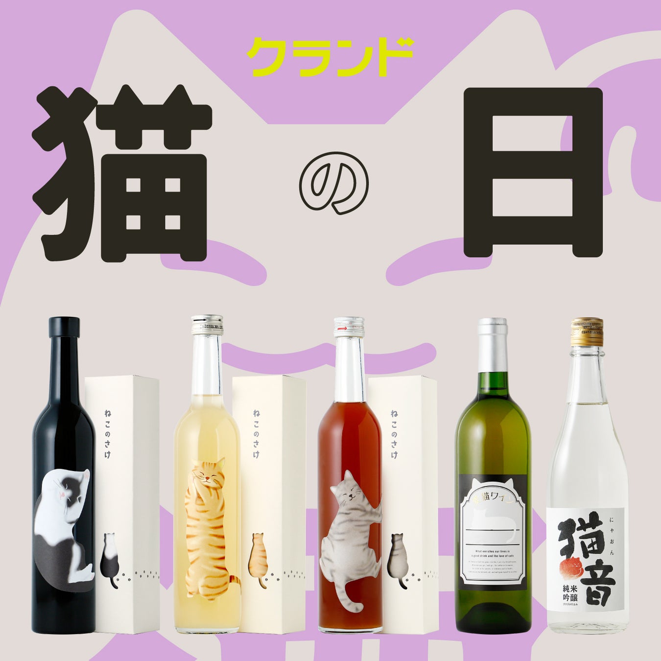 クランドでは、2月22日の「猫の日」にちなみ、5種類の猫のお酒が並ぶ「クランド猫の日」を開催します。猫の「ゴロゴロ音」を222時間聞かせた日本酒「猫音(にゃおん)」や、ラベルに愛猫を描き込んで自分だけの愛猫ラベルを楽しめる「愛猫(らぶねこ)ワイン」、そして今回から登場する、猫の可愛らしいポーズが描かれた猫好きのためのお酒シリーズ「ねこのさけ」3種を加えた、全5種類の猫のお酒が並ぶほか、ねこのお酒の限定セットが登場します。2月22日の「猫の日」はお気に入りの猫酒と一緒に過ごしてみてはいかがでしょうか。