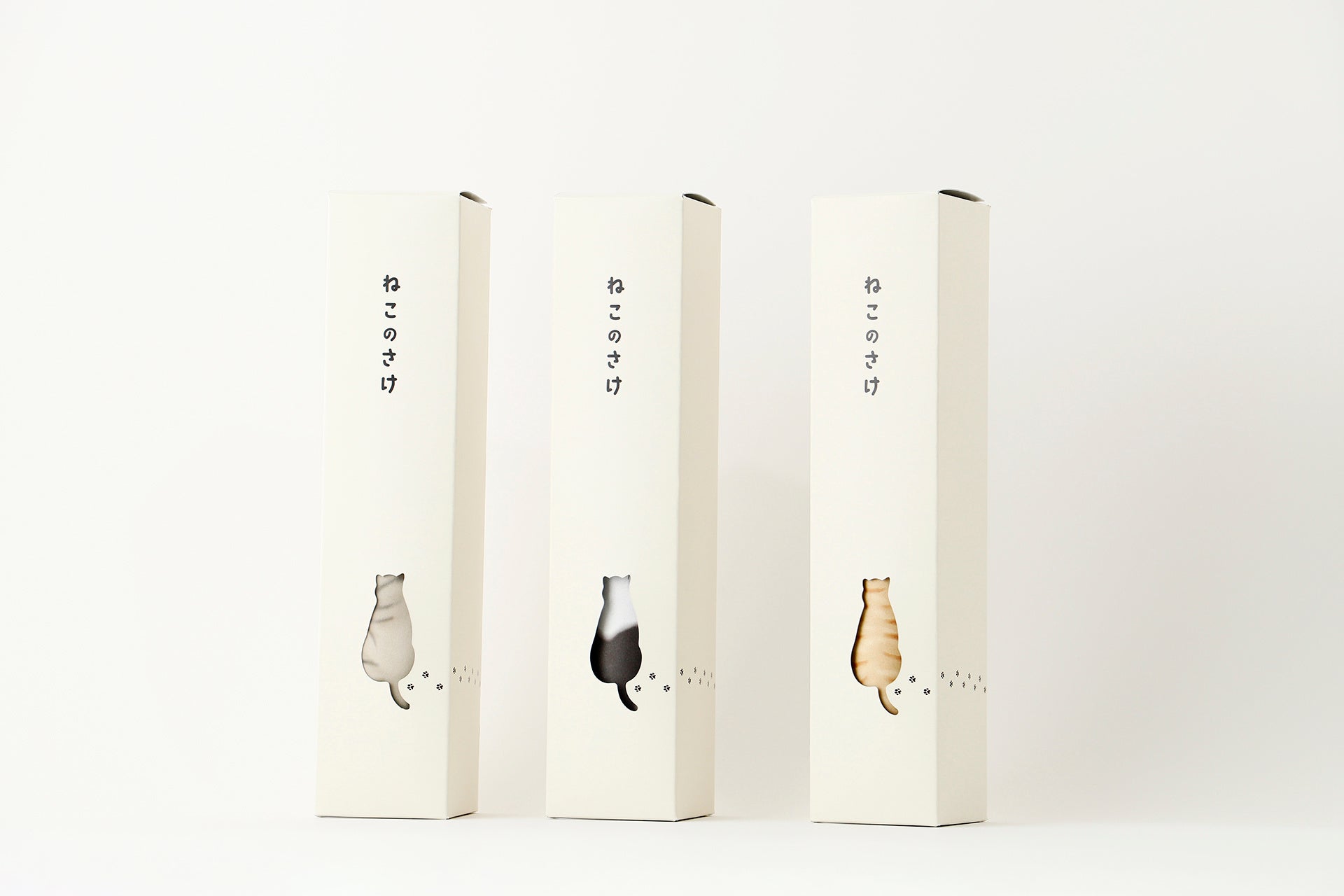 「ねこのさけ」は、オリジナルボックスに入れてお届けします。箱の側面には2つのねこのシルエットが描かれています。ボトルを箱に入れた状態のままくるくると回すと、ねこのシルエットに中のボトルのねこの柄が浮かび上がる仕掛けをお楽しみいただけます。ねこ好きさんへの贈り物にも、「ねこを愛してやまない」自分への贈り物にも、どちらにもおすすめできる1本です。