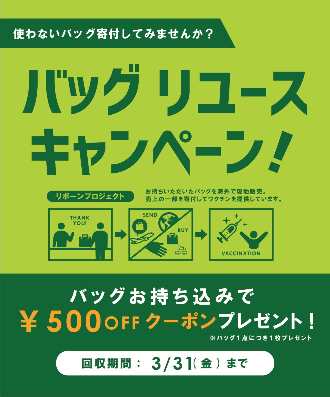 回収品1点につきバッグご購入時に利用頂ける¥500クーポンを進呈。
