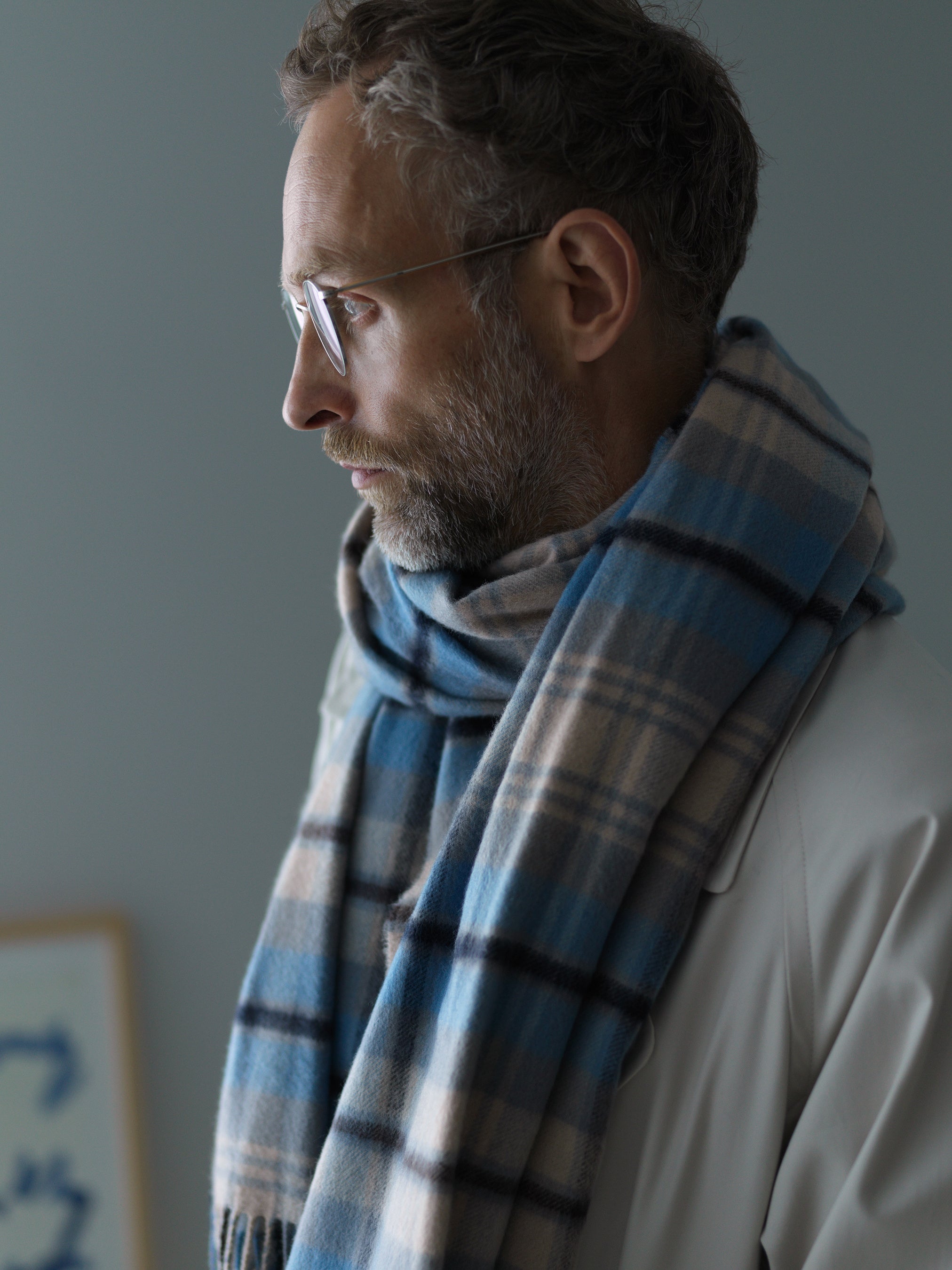 「こちらの大判カシミヤストール、もともとは女性の方に人気の高いジョンストンズ オブ エルガンの代表的なアイテムですが、近年ではユニセックスアイテムが増えてきたこともあり男性の方も着用されることが多くなりました。 特に今回の別注カラーは(タータンが可愛すぎて敬遠してしまう......)といった男性の方にもすんなり受け入れられると思います。 もちろん女性の方にもおすすめです。 この色をこうしてああして......と何度も試行錯誤するなど開発経緯は大変でしたが、ありそうでない、他にはないカラーに仕上がりました。 ぜひこの秋冬に取り入れていただきたいですね」