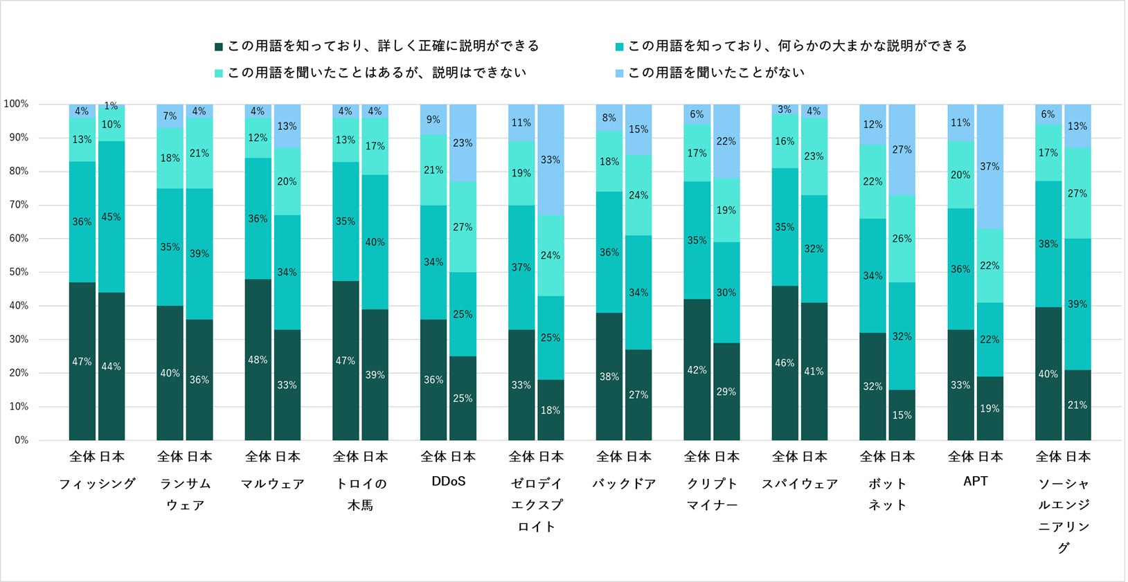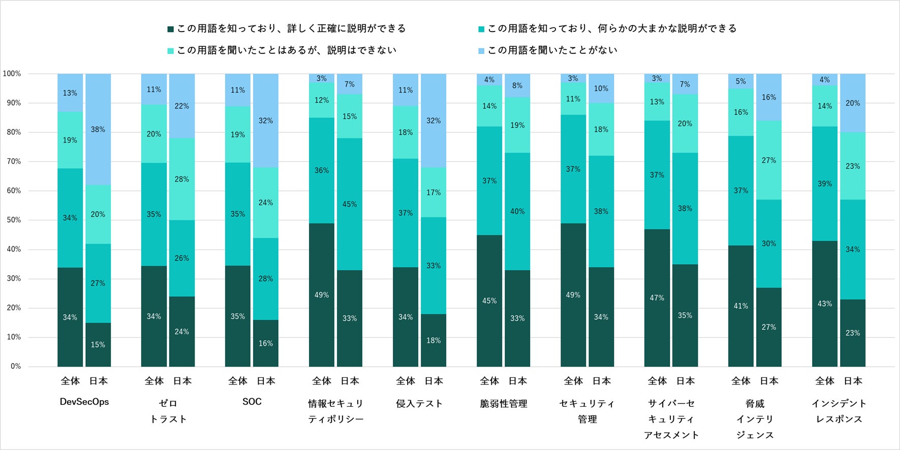 サイバーセキュリティ用語については、約10%の経営幹部が、DevSecOps(全体13%、日本38%)、ゼロトラスト(全体11%、日本22%)、SOC(全体11%、日本32%)、侵入テスト(全体11%、日本32%)を聞いたことがないと回答しました。