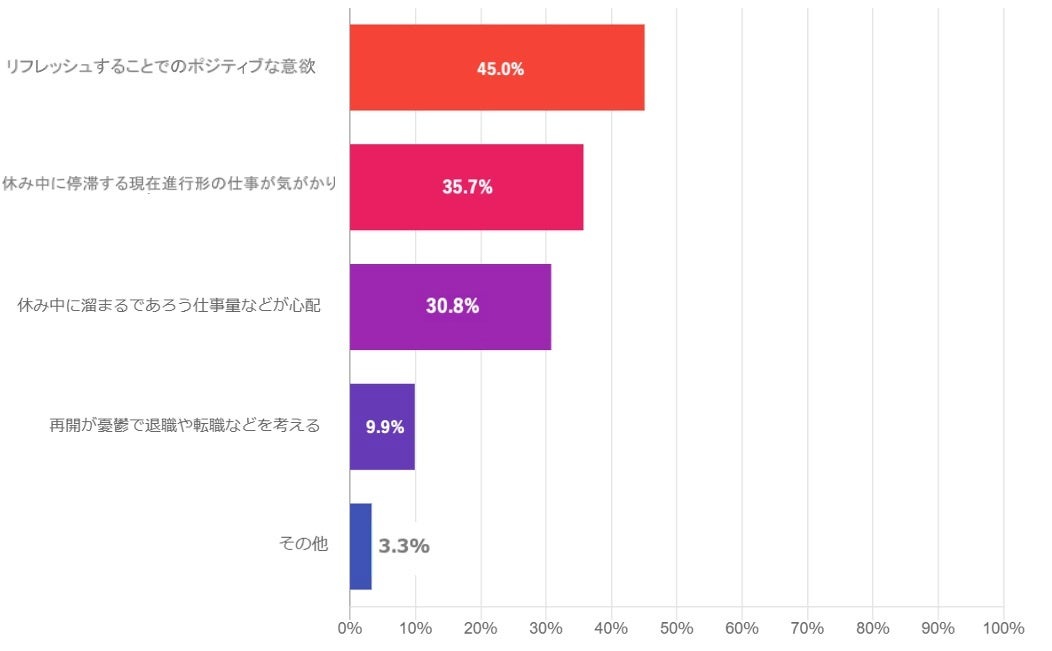 “休み中に仕事のことを考えますか?”と聞いたところ、全体の39.3%が「まったく考えないと思う」と回答。「少しは考えると思う」「常に考えると思う」と回答した人でも、“どんなことを考えると思いますか?”との質問に、48.7%の人が「リフレッシュすることでのポジティブな意欲」を挙げました。
