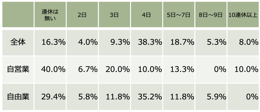 さらに自営業・自由業では「連休は無い」が40.0%・29.4%と全体より高い傾向に。