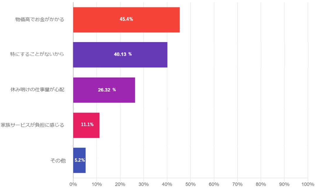 GWにかける予算を聞いたところ、「特別な予算はかけない」が45.7%と最多。主な予定も「自宅でのんびり過ごす」が53.4%、「近場への外出」が37.0%など、全体的に節約傾向が伺えました。あわせて、“長期休暇があることで仕事へのプラスの影響はあると思いますか”の質問に「あまり思わない」「思わない」「どちらとも言えない」と回答した人が挙げた理由で最多だったのが「物価高でお金がかかる」の45.4%でした。