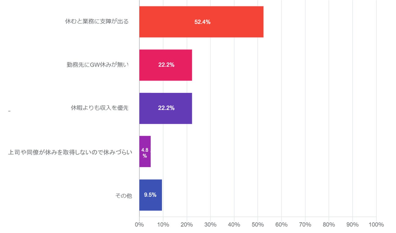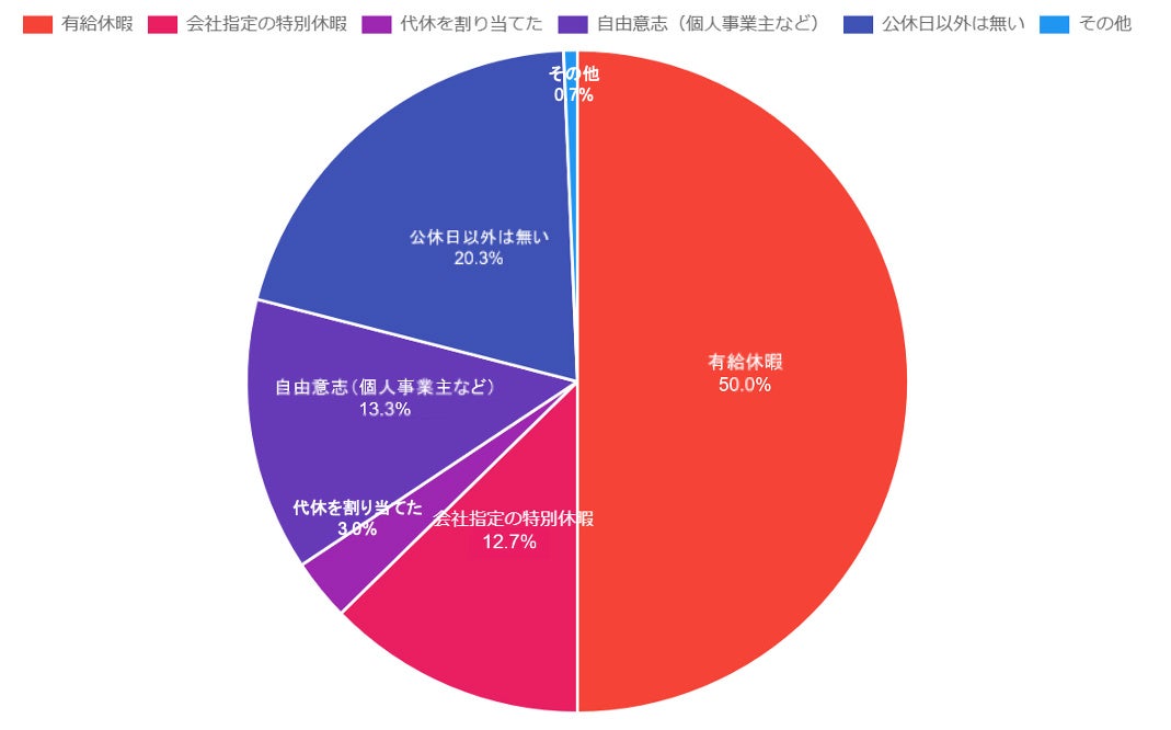 公休日以外の休暇の取得方法としては、半数の50.0%が「有給休暇」と回答。「会社指定の特別休暇」も12.7%ありました。また、「公休日以外は無い」という人にその理由を尋ねると、「休むと業務に支障が出る」が52.4%と最も多く、「休暇より収入を優先」との回答も22.2%ありました。