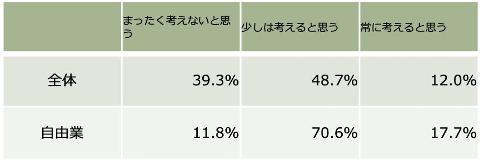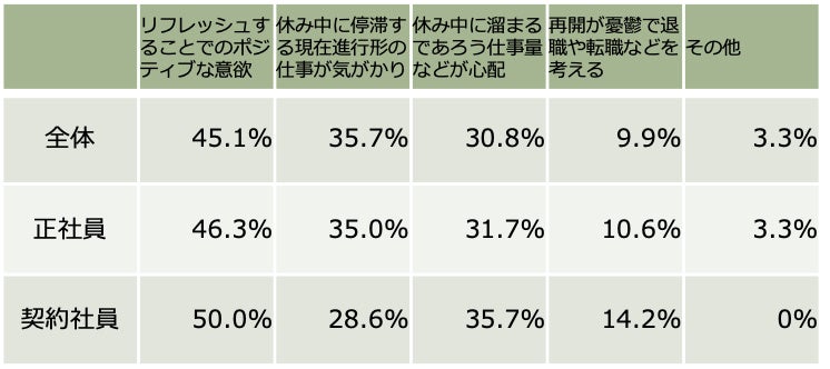 ただ、一方で「休み中に溜まるであろう仕事量などが心配」(30.8%)や「再開が憂鬱で退職や転職などを考える」といった回答も全体で9.9%あり、このうち正社員と契約社員では、それぞれ10.6%と14.2%みられました。また、「少しは考えると思う」「常に考えると思う」の回答を自由業(フリーランス)に限ると、88.3%に上り、会社員との意識の差が伺えました。