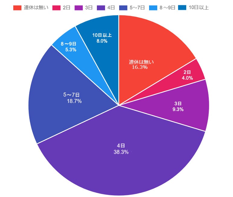■連休の日数は4日が最多。なかには10日以上も8.0%の一方「連休は無い」が16.3%。