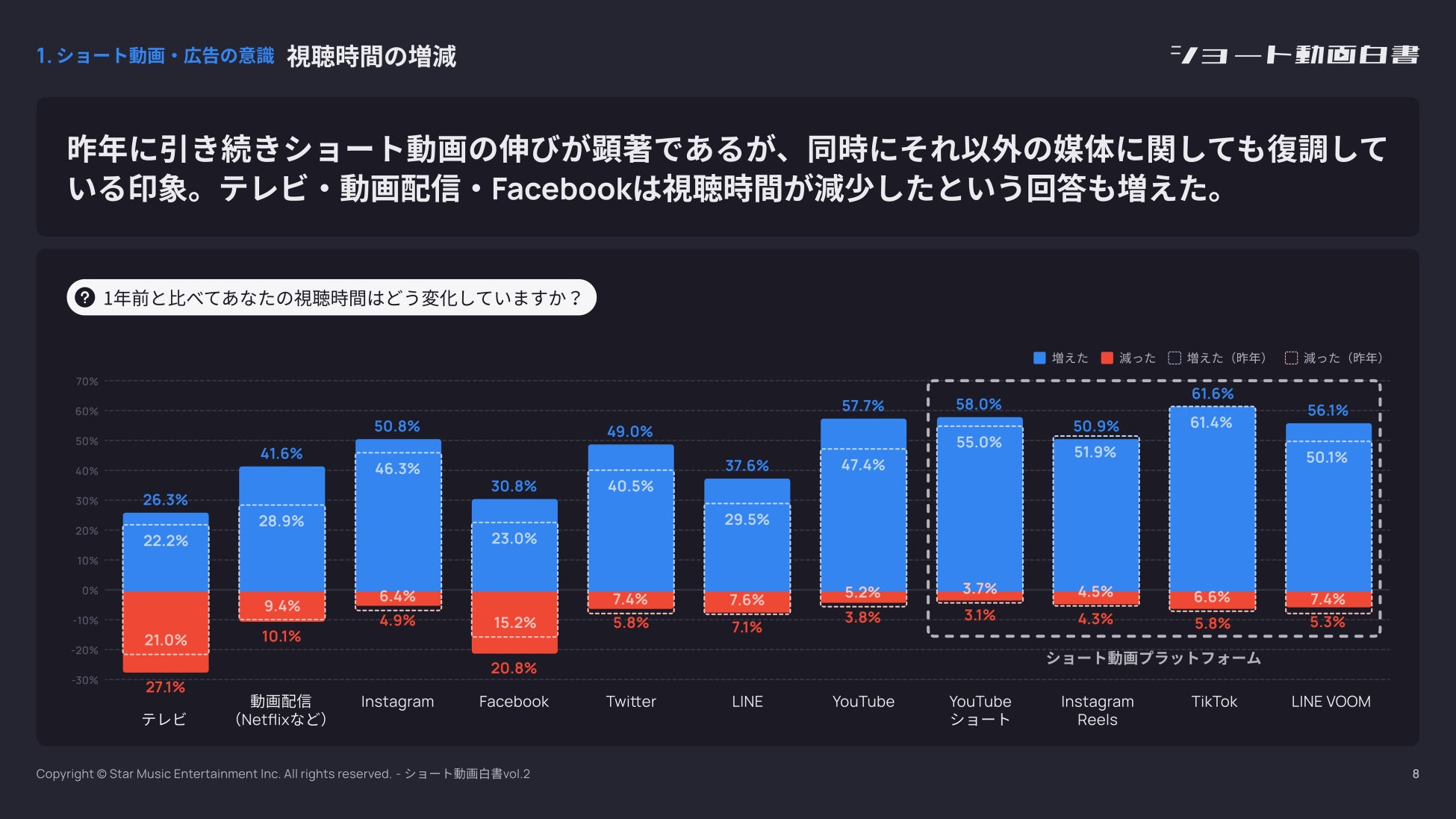 昨年に引き続き、ショート動画の視聴時間の伸びが顕著になっています。