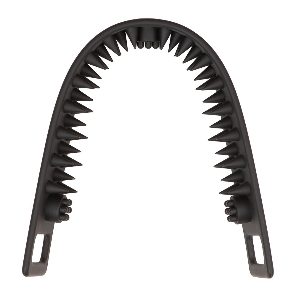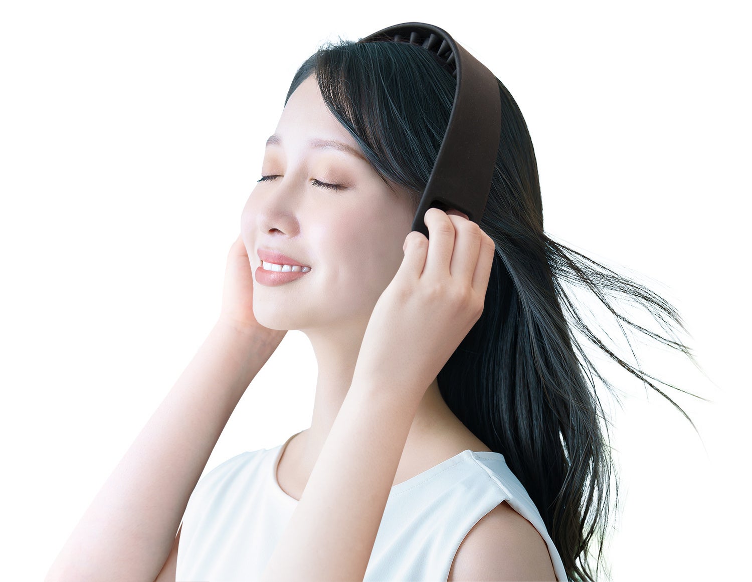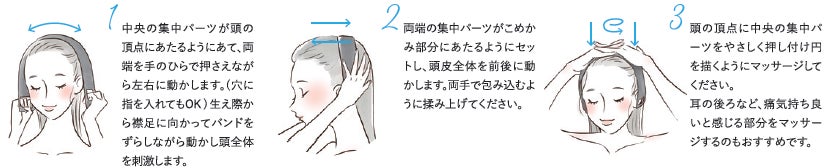1.中央の集中パーツが頭の頂点にあたるようにあて、両端を手のひらで押さえながら左右に動かします。(穴に指を入れてもOK)生え際から襟足に向かってバンドをずらしながら動かし頭全体を刺激します。