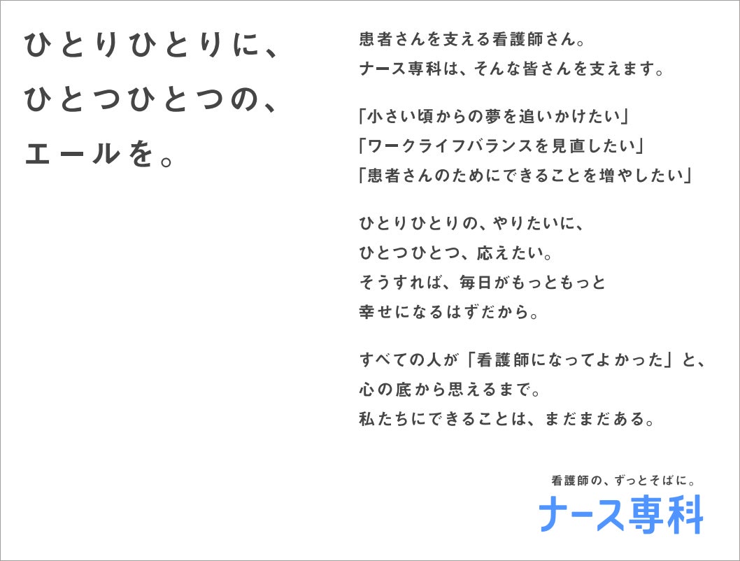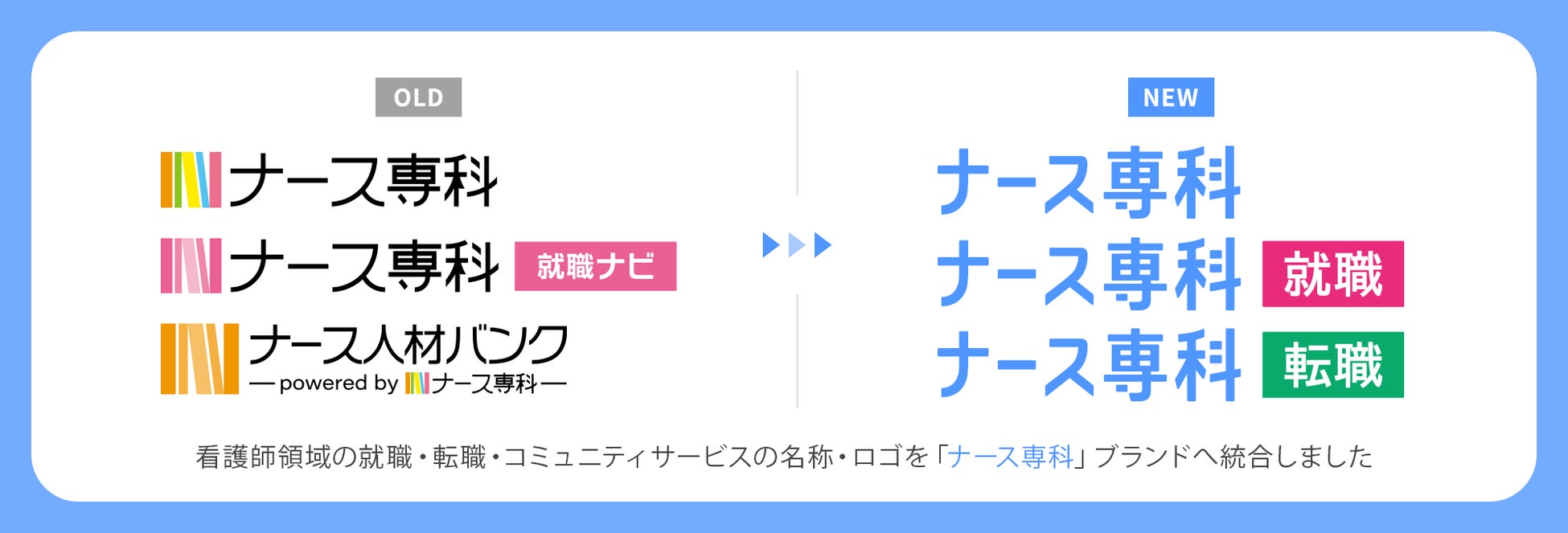 この度、看護師領域の就職・転職・コミュニティサービスのブランドをナース専科に統合しました。ナース専科は、社会全体のライフスタイルや医療・介護のニーズが時代と共に移り変わる中でも、すべての看護師が「看護師になってよかった」と思える環境を創ることで、質の高い医療・介護サービスの継続提供に貢献していきます。
