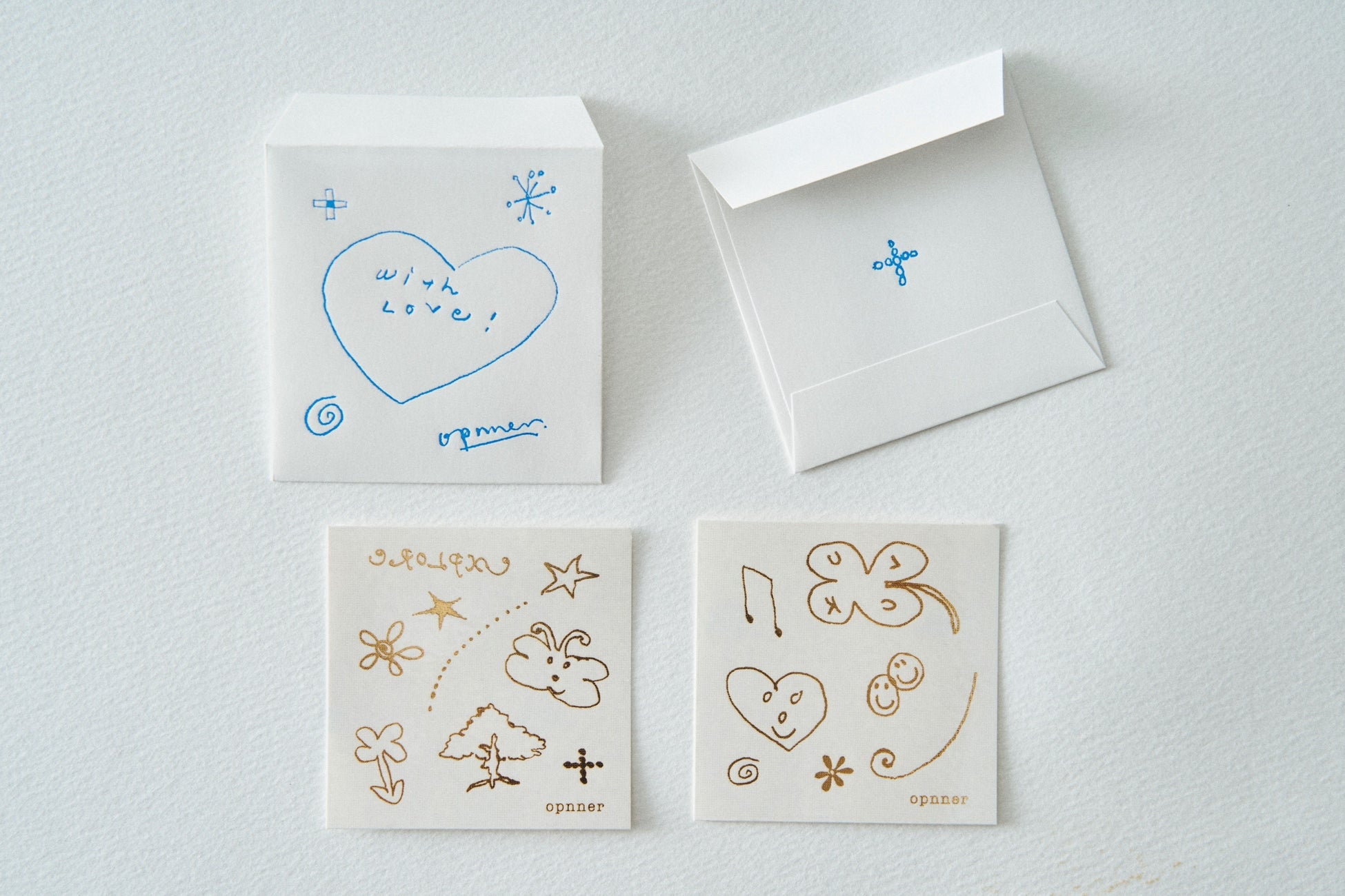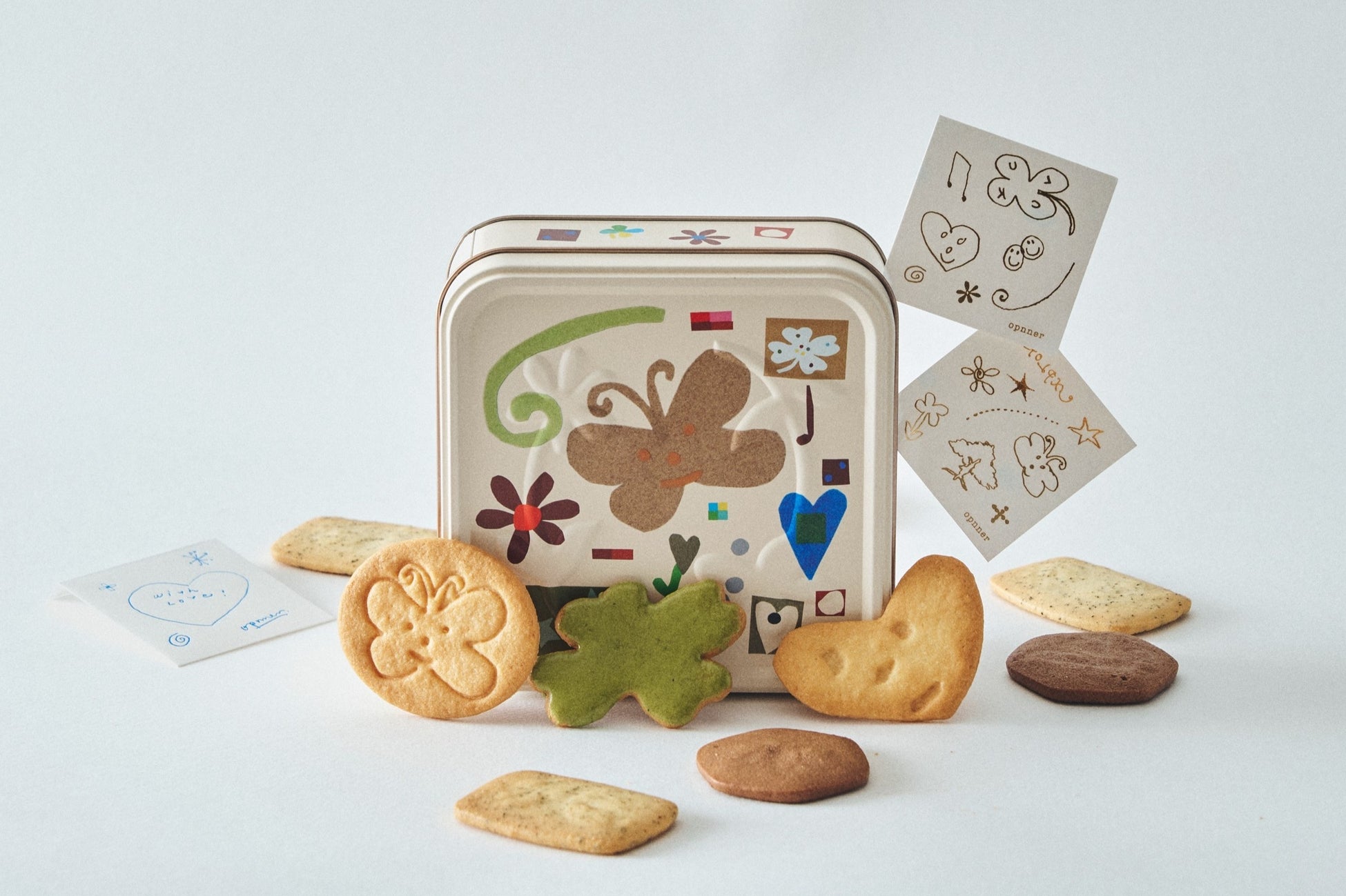 ビスケットは全部で5種類。ちょうちょ・ハート・クローバーの3種は、「opnner〈オプナー〉」のイラストや切り絵をもとにかたちにした、この缶だけの特別なビスケット。ひとつひとつアトリエで手づくりし、思い出のかけらのように散りばめています。