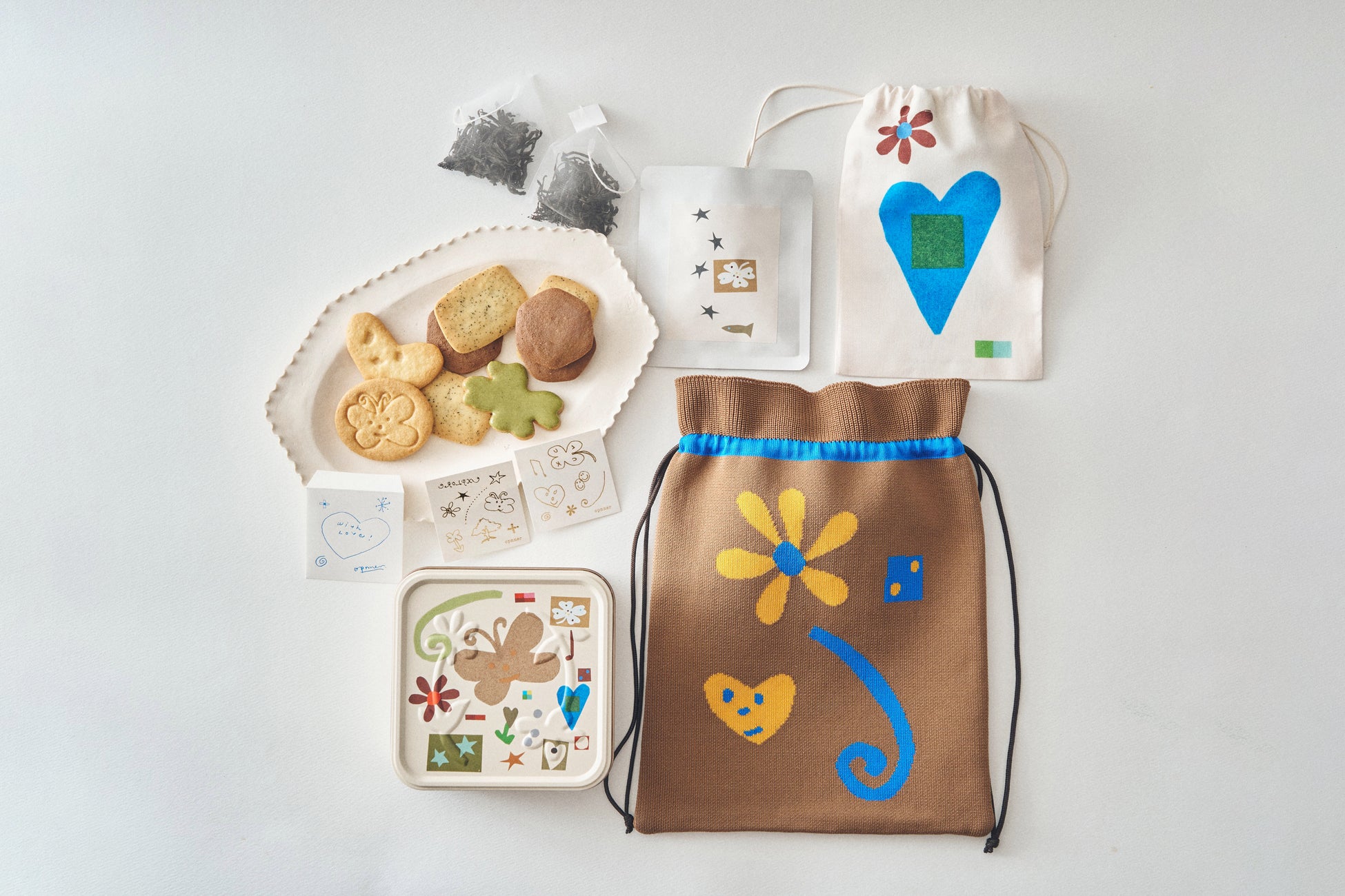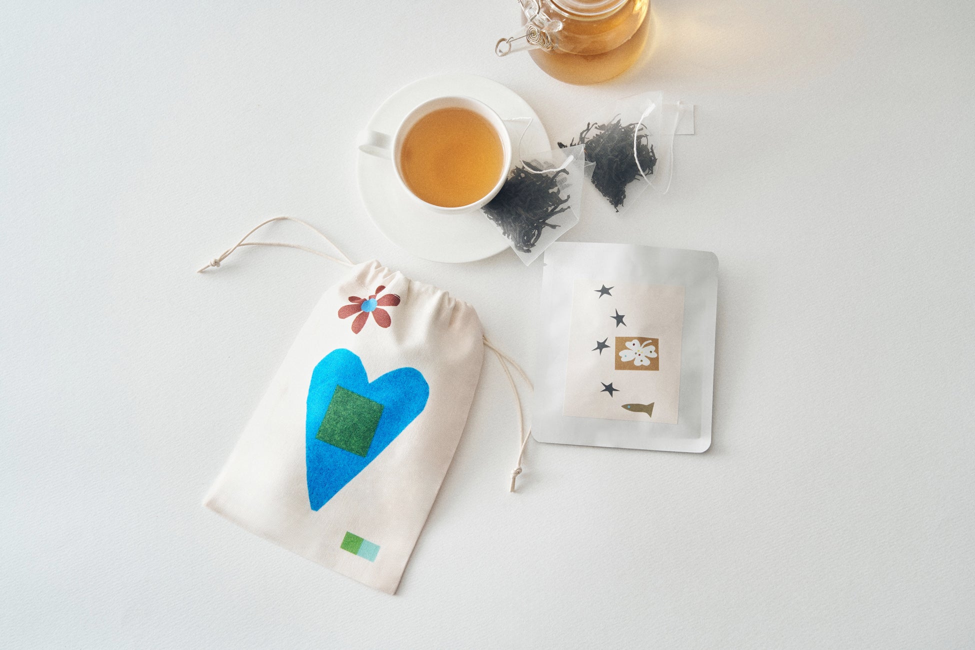 ビスケット缶、和紅茶&巾着のセットに、今回のテーマ「Tiny Pocket Collage」とリンクした、オリジナルデザインのドローストリングバッグを加えた、特別なセットをご用意しました。