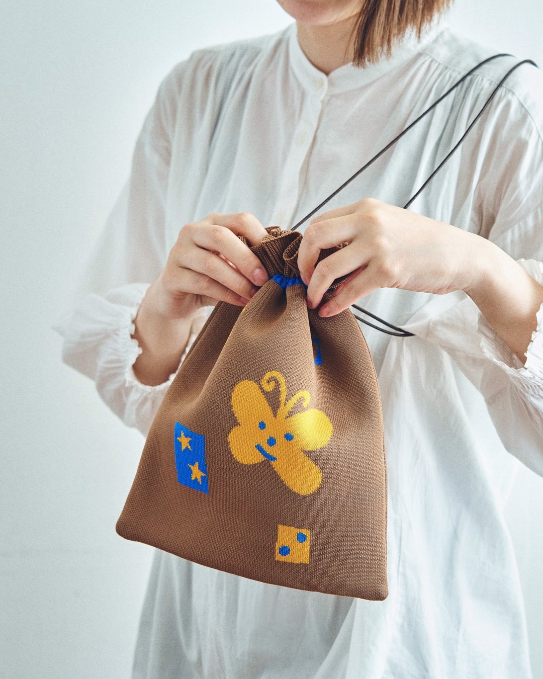 バッグは、ハリのあるニット生地を丁寧に編み上げた巾着型。