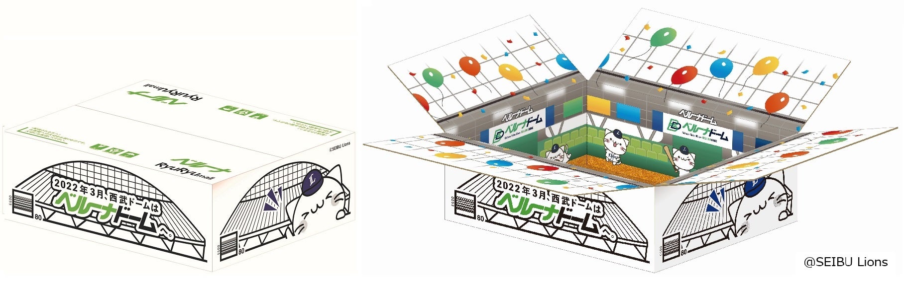 ベルーナは西武ドームのネーミングライツを取得し、2022年3月1日より「ベルーナドーム」が誕生しました。これを記念し、ベルーナネット、RyuRyumall、その他カタログ・チラシからのご購入商品を対象に、ベルーナドームとベルーナ公式キャラクターのべるーにゃが描かれた特別デザイン配送箱にてお届けします。