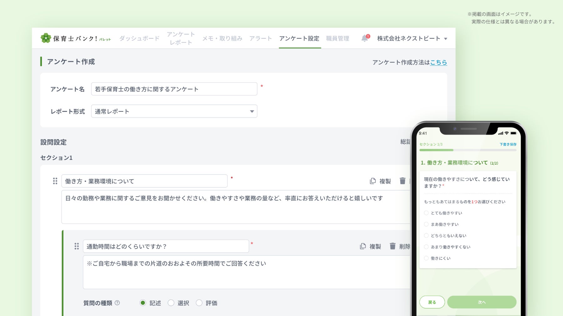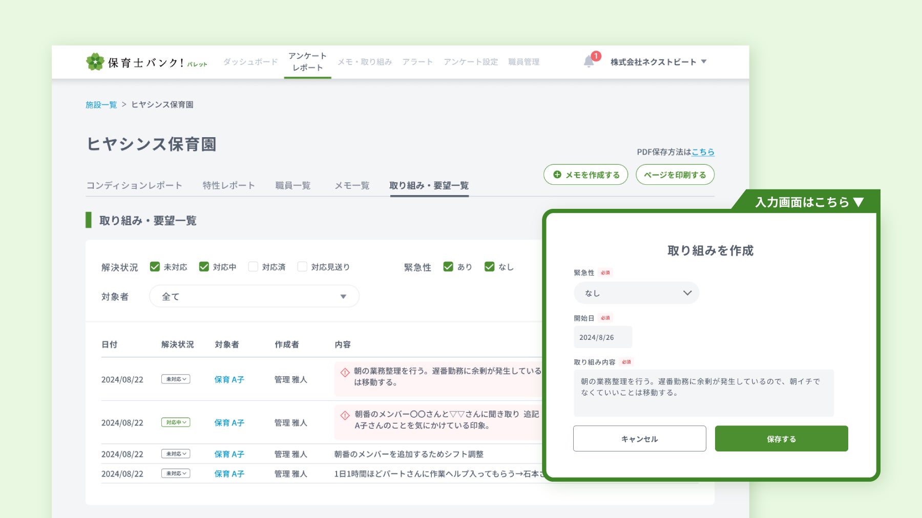 また、保育士の業務パフォーマンス向上を支援するデータ分析機能に加え、日々の行動を記録・共有できる「取り組みメモ」機能や、保護者・職員の声を集め園づくりに活かせる「アンケート作成機能」など、成長と運営改善を後押しする機能を順次拡充しています。これにより、保育施設の運営効率と質の向上を図ることが可能です。