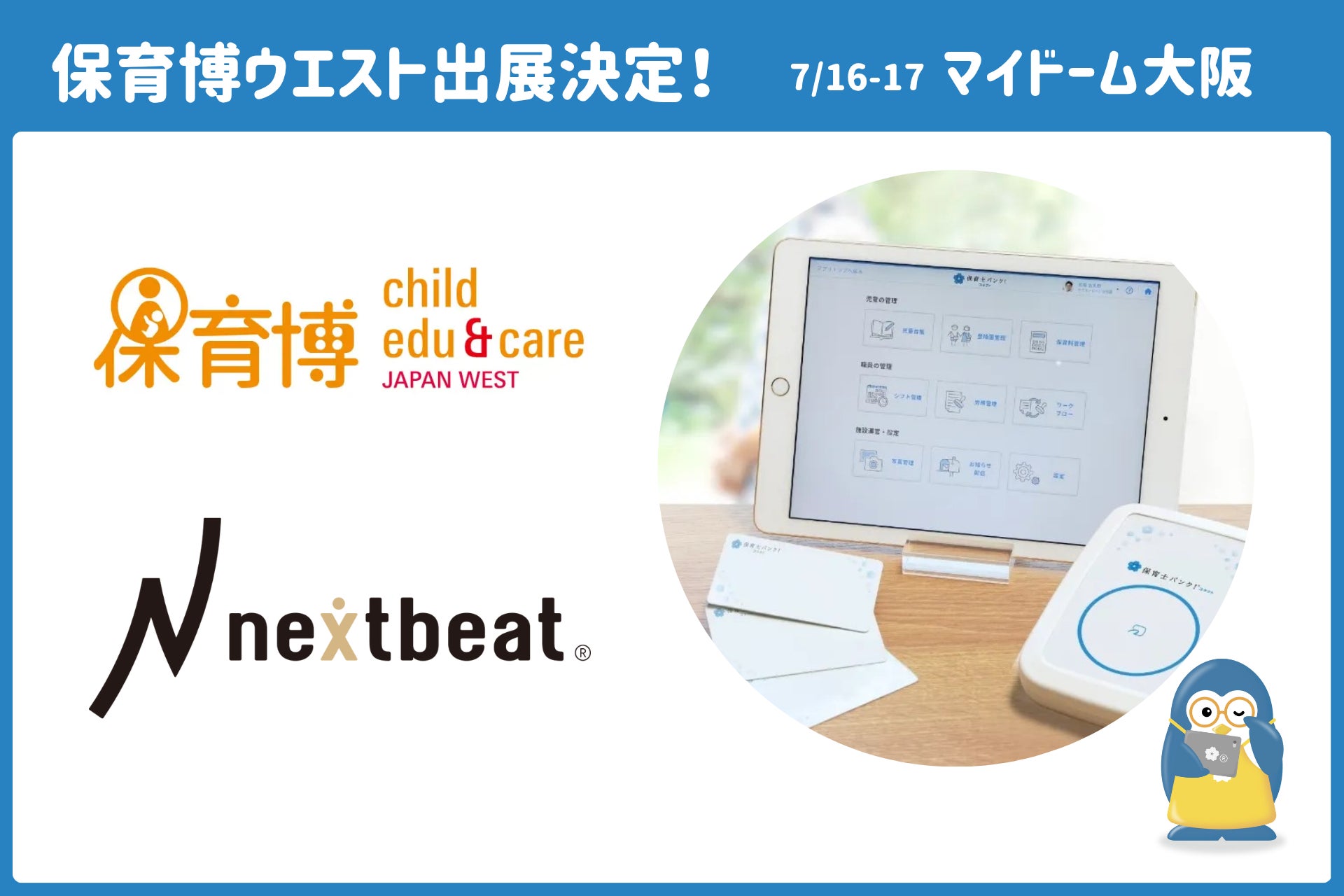 保育施設の様々な課題をテクノロジーの力で解決するプラットフォーム「保育士バンク!」を運営する株式会社ネクストビート(本社:東京都渋谷区、代表取締役:三原誠司)は、2025年7月16日(水)~17日(木)にマイドームおおさかで開催される保育・教育に関連する製品・サービスの商談見本市「保育博ウエスト2025」(事務局:メッセフランクフルト ジャパン株式会社)に出展いたします。