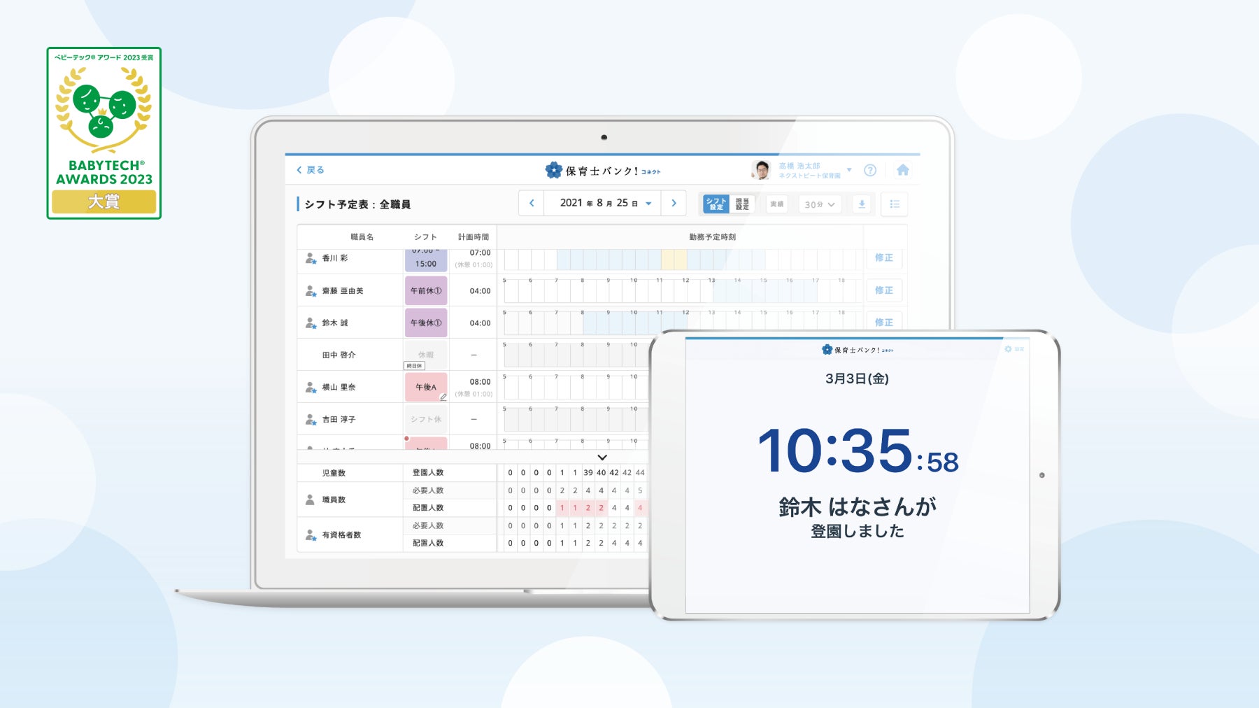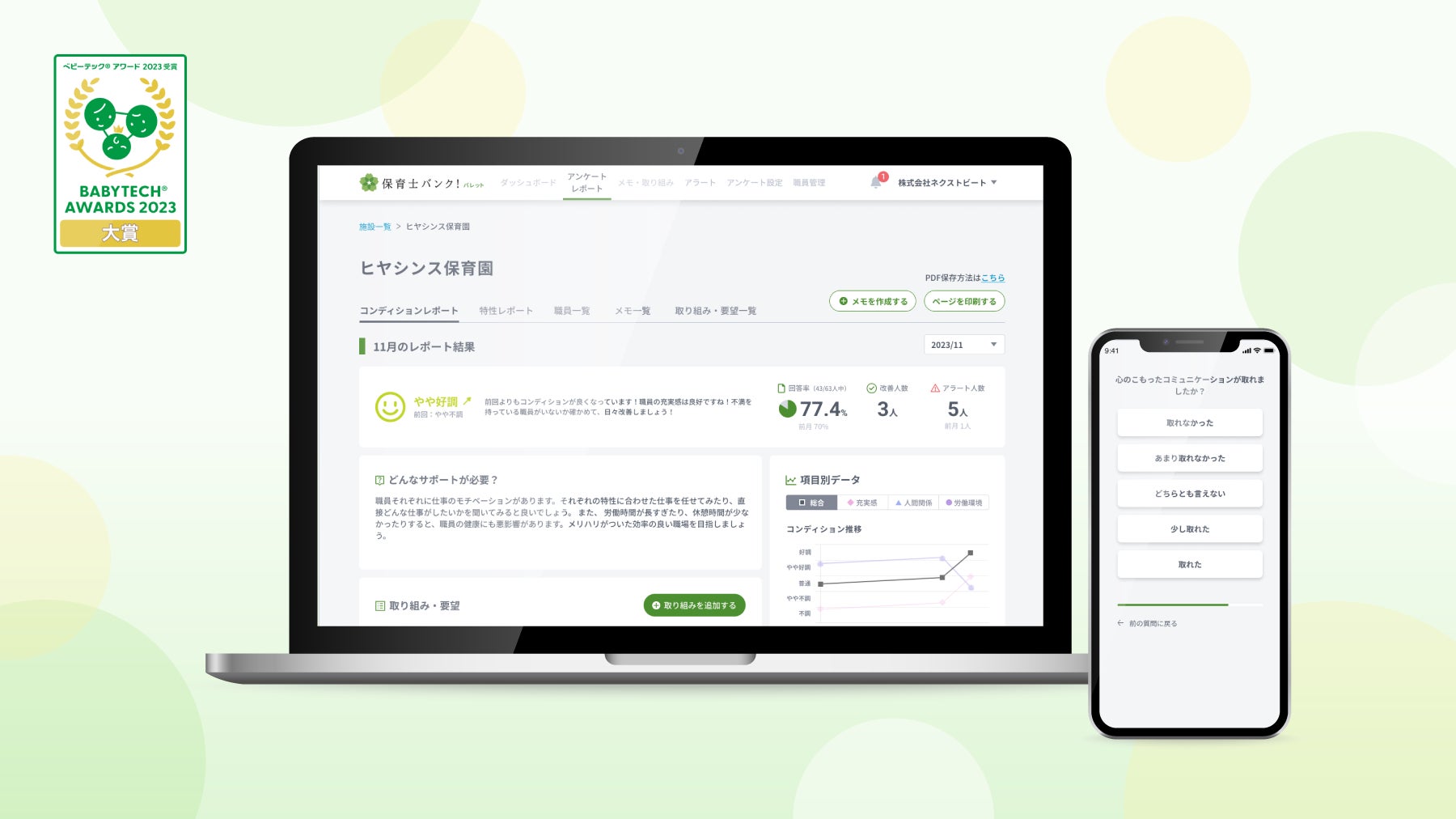 BabyTech® Awards 2023 保育ICT部門において大賞を受賞するなど、保育施設に関わる人々のエンゲージメントを高め、人的資本としての価値創造に貢献しています。