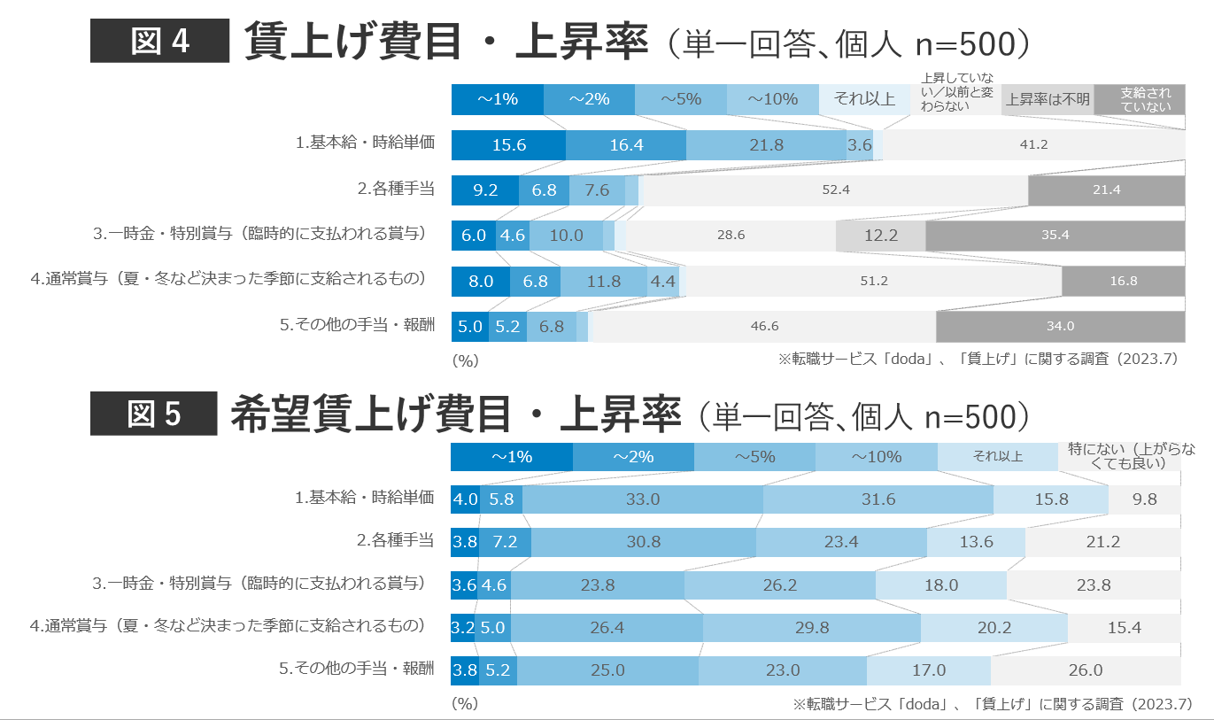 個人に対し賃上げの実績と希望する上昇率を調査したところ、実績で最も割合が多かった上昇率は「2.1%~5%」(21.8%)で、「基本給・時給単価」で給与に反映されていることが分かりました【図4】参照)。