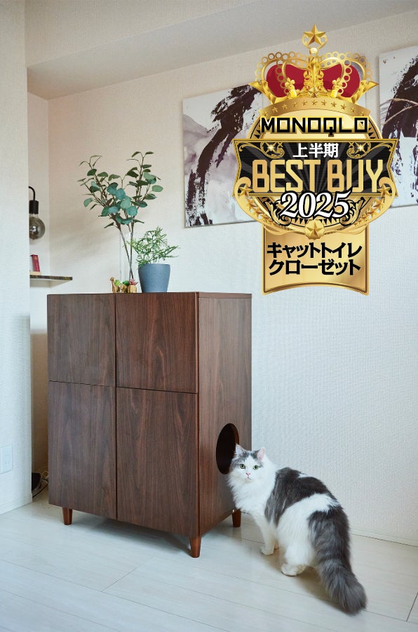 上段には猫用品を、下段には猫トイレを入れて使用できるクローゼットです。こちらは、下段の高さと広さ(猫が用を足すのに十分なスペースかどうか)と、リビングに調和するデザイン性で高評価を獲得しました。